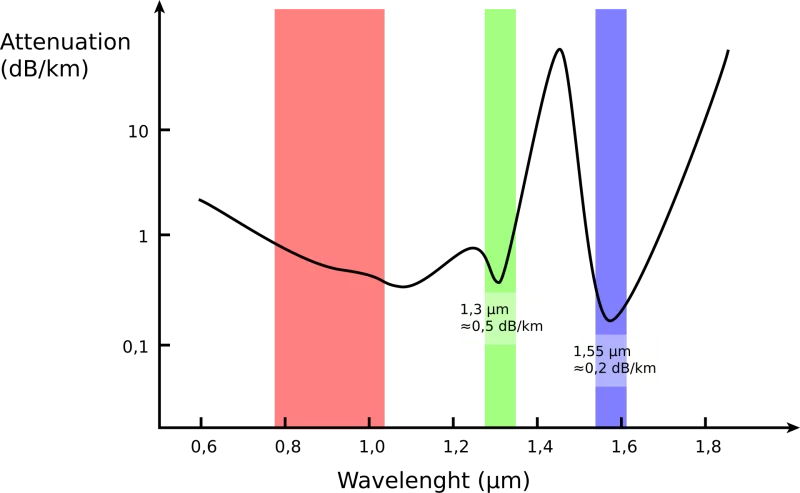 Потери на километр волокна (их также называют километрическими потерями) зависят от длины волны света, который через него проходит.
