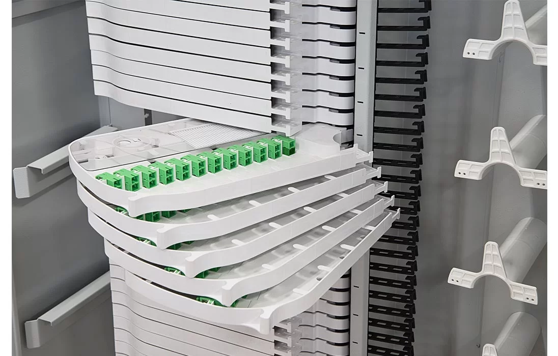 Конструктивной особенностью данного решения является монтаж и кросс-коммутация ОВ в поворотных кроссовых модулях, объединенных в кроссовые блоки. В модуле выделено место для укладки ОВ и размещения адаптеров (до 24 SC или LC). В собранном состоянии модули размещаются в блоке горизонтально, при этом фронтально расположенные адаптеры закрыты передней стенкой модуля. При повороте модуля обеспечивается удобный доступ к адаптерам и пигтейлам. Для монтажа модуль свободно снимается с блока за счет запаса длины транспортных трубок.