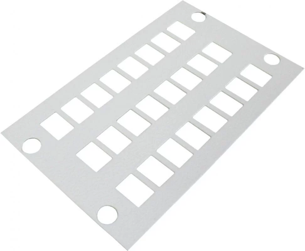 Сделана из листового металла, окрашена в серый цвет, используется в стоечных кроссах для установки оптических розеток.