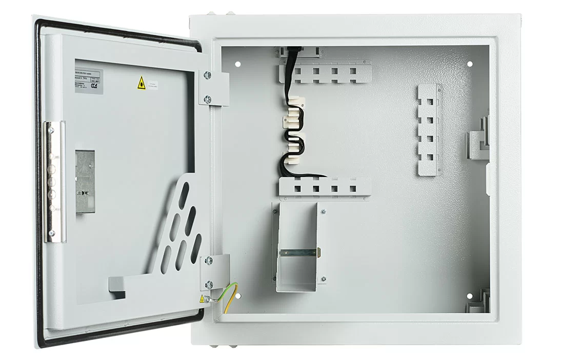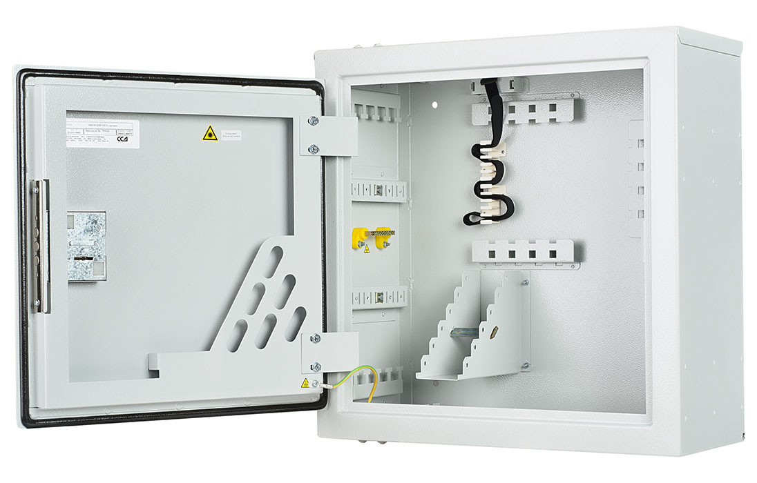 В шкафу предусмотрены несколько монтажных зон. В зоне ввода оптические кабели разделываются и фиксируются. Далее волокна в транспортных трубках поступают в зону монтажа на соответствующий кроссовый модуль. Планарные оптические разветвители устанавливаются в специальные контейнеры на правой боковой стенке шкафа.