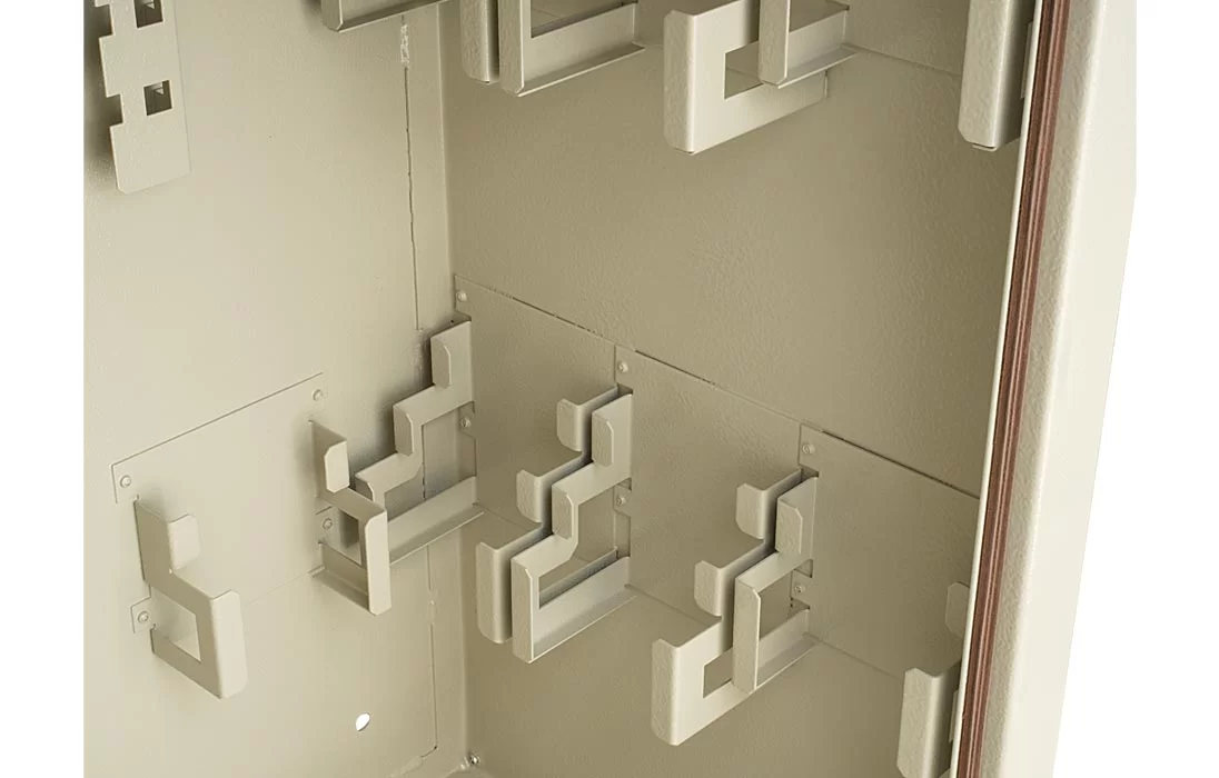 В шкафу предусмотрены несколько монтажных зон. В зоне ввода оптические кабели разделываются и фиксируются. Далее волокна в транспортных трубках поступают в зону монтажа на соответствующий кроссовый модуль. Планарные оптические разветвители устанавливаются в специальные контейнеры на правой боковой стенке шкафа.