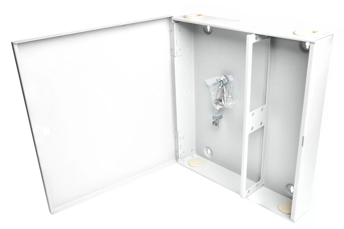 Кросс оптический ШКОН-32 это настенное коммутационно-распределительное устройство емкостью до 32 портов. Изготовлен из металла, имеет закрывающуюся дверную панель с замком и ключами и 4-е кабельных ввода. Внутри корпус кросса разделяется вертикальной перегородкой на монтажный (со сплайс-кассетой) и распределительный отсек. Сменные адаптерные панели закрепляются на внутренней перегородке корпуса с помощью защёлок. В монтажном отсеке ШКОН-32 можно разместить до 2-х пластиковых сплайс-кассет с крышкой и запас кабеля.