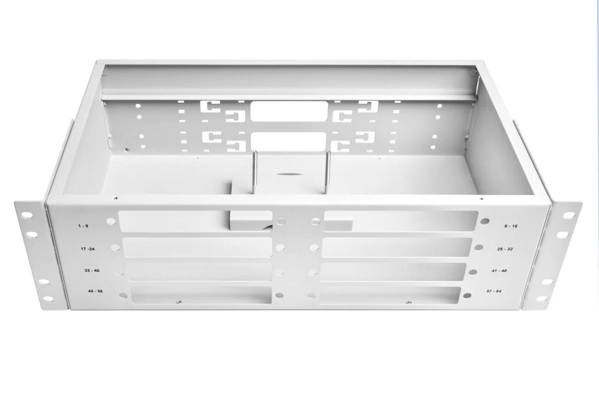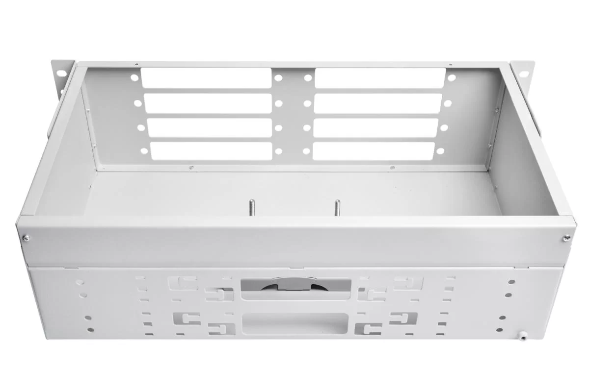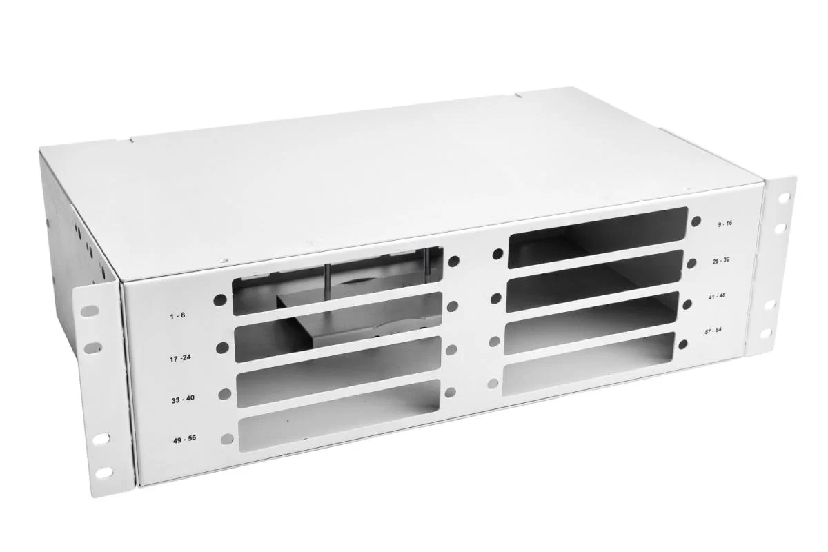 Кросс оптический стоечный ШКОС-64 для установки в 19" шкаф или стойку строго соответствует метрическим размерам и предназначен для концевой заделки, распределения и коммутации оптических кабелей связи. Высота кросса - 3U. Емкость оптического кросса – до 64 оптических портов FC, ST, SC, MT-RJ типов. Конструкция рэкового кросса ШКОС-64 предусматривает специальные гнёзда для установки адаптерных планок. На лицевой части корпуса нанесена маркировка портов. Корпус стоечного кросса изготовлен из стали и покрыт порошковой краской