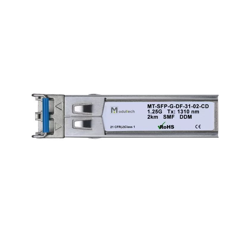 Оптический трансивер MT-SFP-G-DF-31-02-CD компании Modultech представляет собой съемный приемопередающий оптический модуль в форм-факторе SFP (Small Form-factor Pluggable), используется для организации каналов связи по протоколам STM-8/OC-24, GigabitEthernet, 1G FiberChannel. Номинальная скорость передачи данных составляет 1,25 Гбит/с.