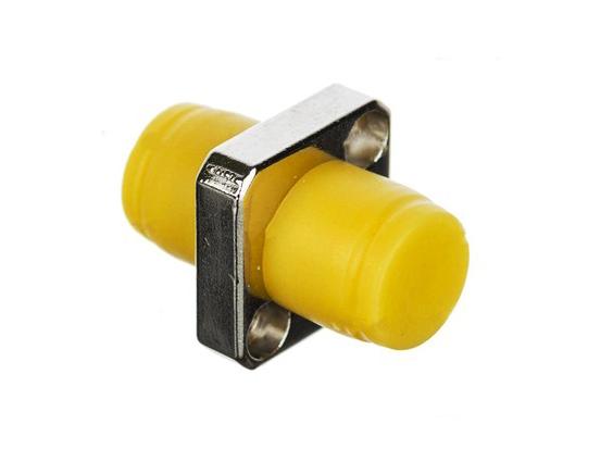 Крепление адаптера к патч-панелям оптических кроссов и муфт осуществляется при помощи шайбы, гайки и, дополнительно при помощи винтов. Оптический адаптер FC/UPC MM с разобранным квадратным фланцем оснащен пластиковыми заглушками желтого цвета, которые надежно защищают керамический центратор от попадания пыли.
