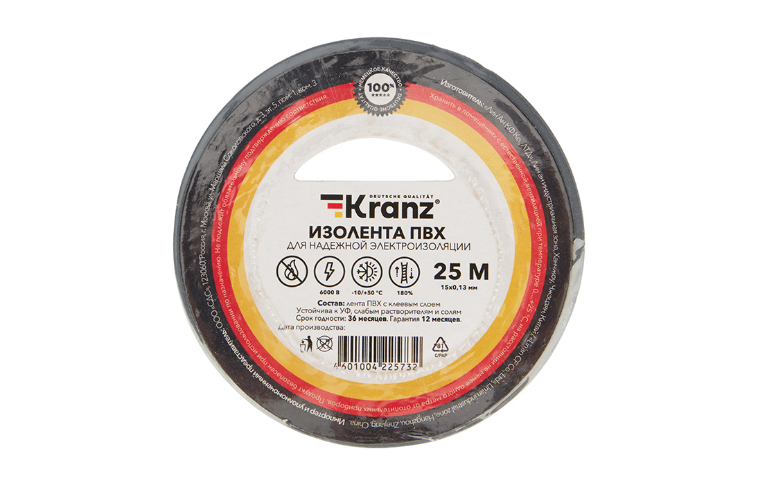 Изолента KRANZ предназначена для электрической изоляции, цветной маркировки, соединения, защиты от внешних факторов и герметизации кабелей, проводов и шнуров.