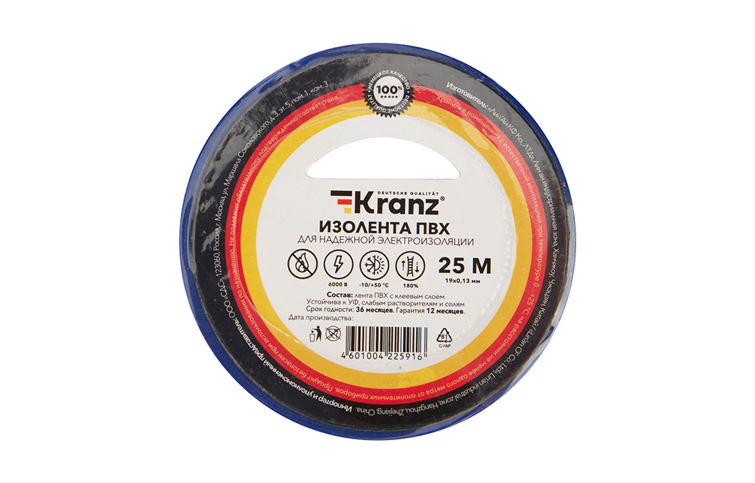 Изолента KRANZ предназначена для электрической изоляции, цветной маркировки, соединения, защиты от внешних факторов и герметизации кабелей, проводов и шнуров.