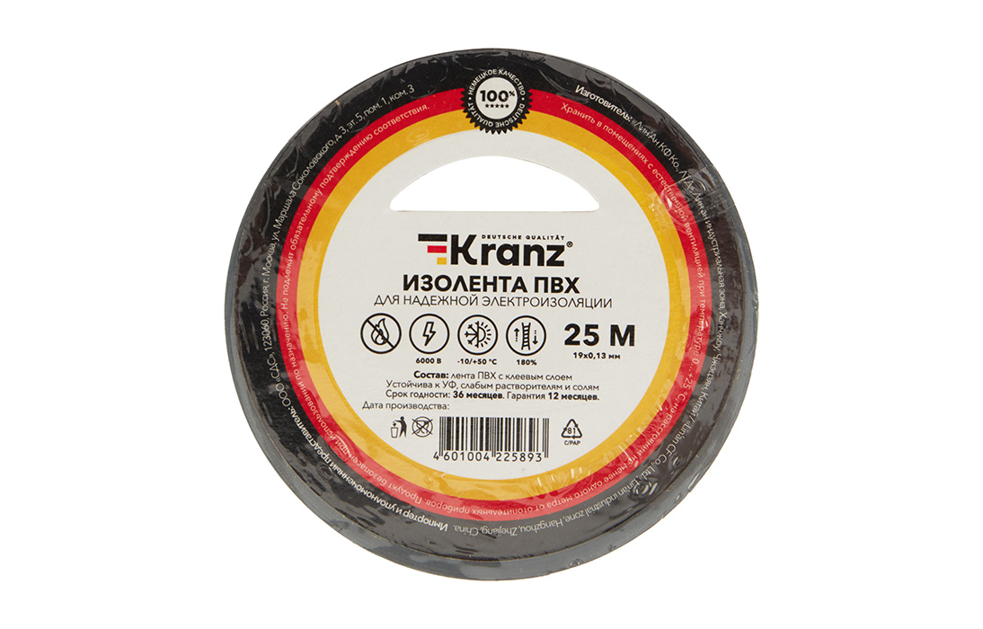 Изолента KRANZ предназначена для электрической изоляции, цветной маркировки, соединения, защиты от внешних факторов и герметизации кабелей, проводов и шнуров.