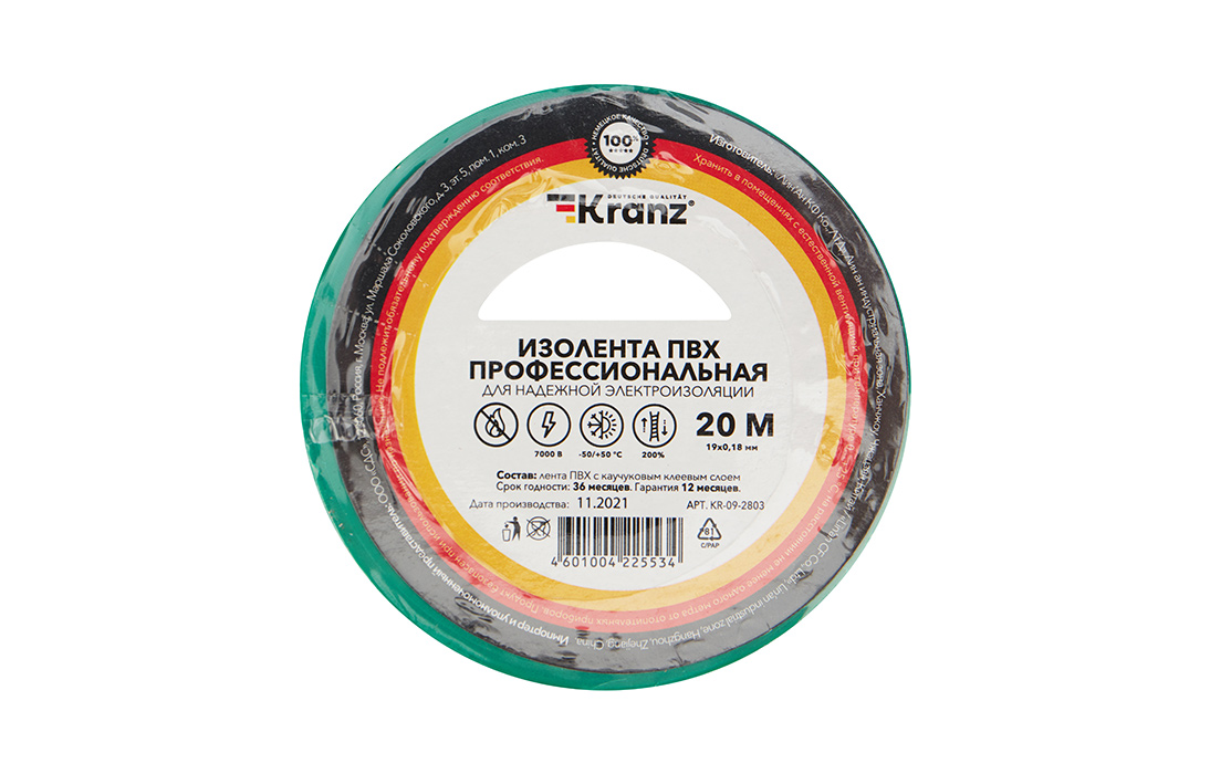 Профессиональная изоляционная лента KRANZ класса PREMIUM используется для электрической изоляции, цветной маркировки, соединения, защиты от внешних факторов и герметизации кабелей, проводов и шнуров.
