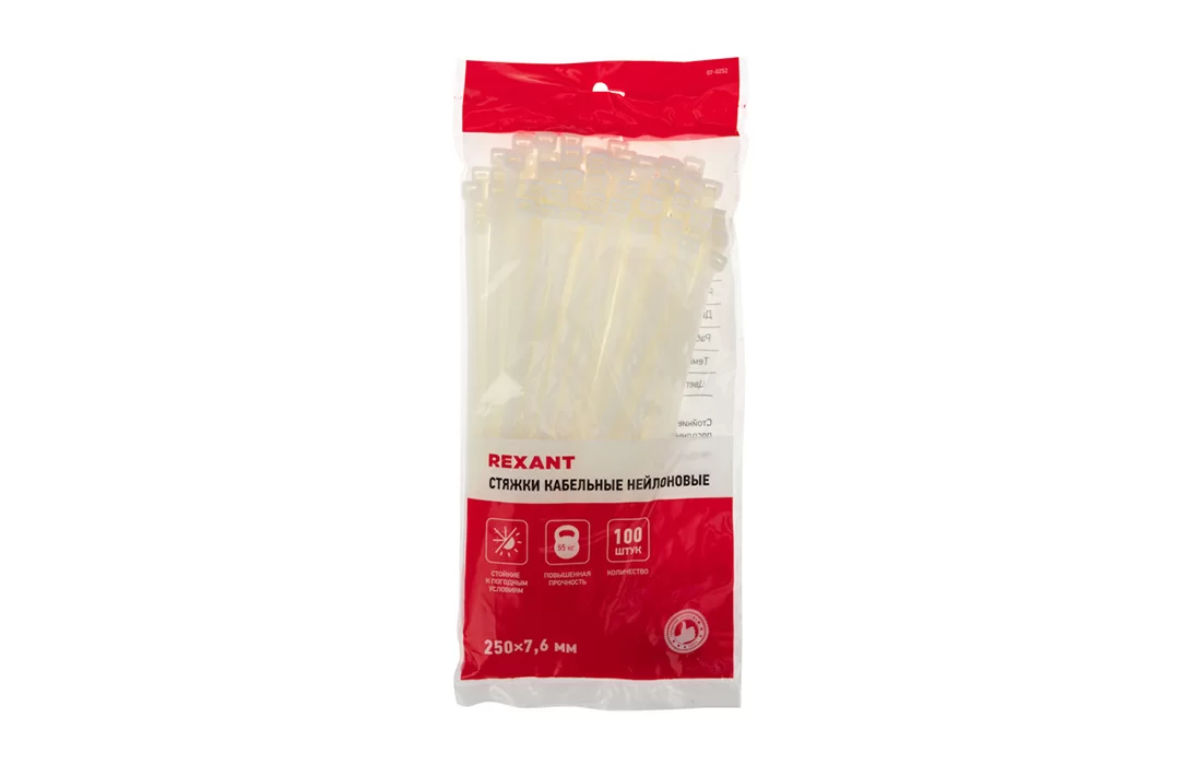 07-0252 Хомут-стяжка кабельная нейлоновая REXANT 250 x7,6 мм, белая, упаковка 100 шт.