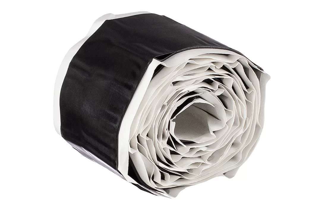Лента герметизирующая на полиэтиленовой основе с клеевым слоем постоянной липкости, черного цвета, дублирована одним слоем силикононизированной бумаги.