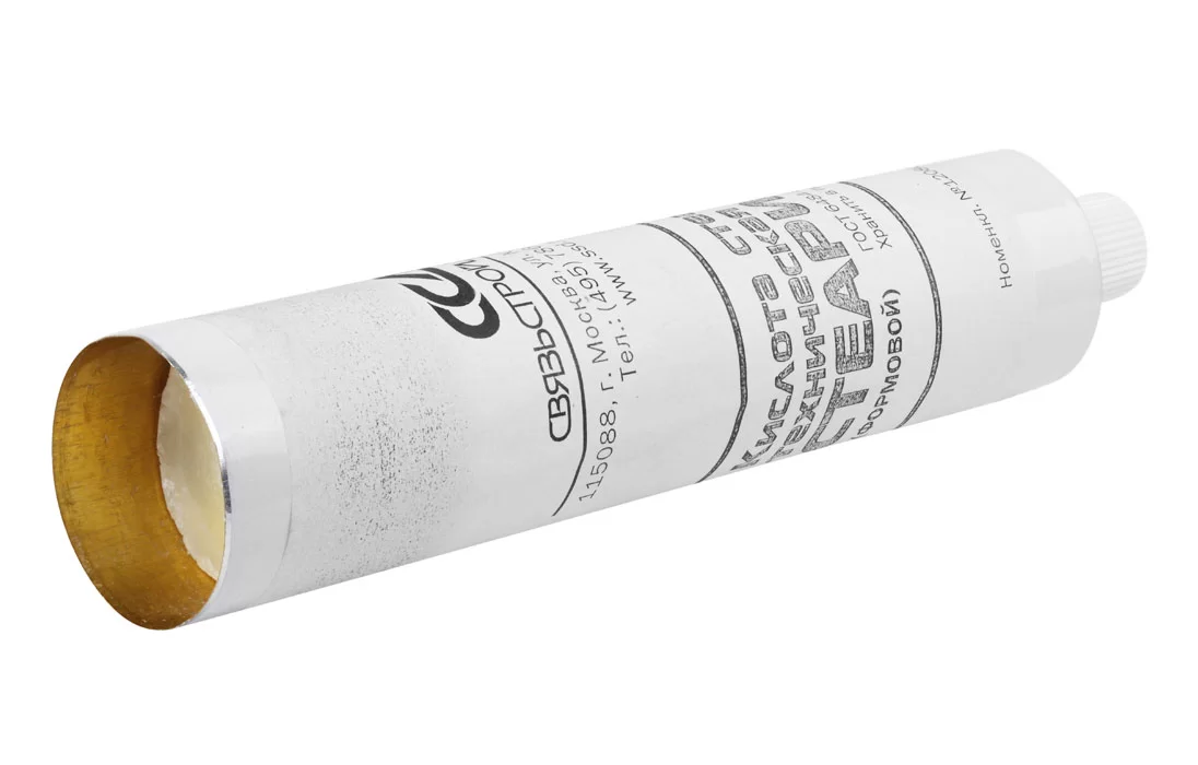 Поставляется залитым в открытую тубу из алюминиевой фольги. Цилиндр стеарина легко выдвигается из тубы. Защищенный тубой цилиндр стеарина не разрушается и при переноске в сумке не загрязняет находящиеся вместе инструменты и материалы.