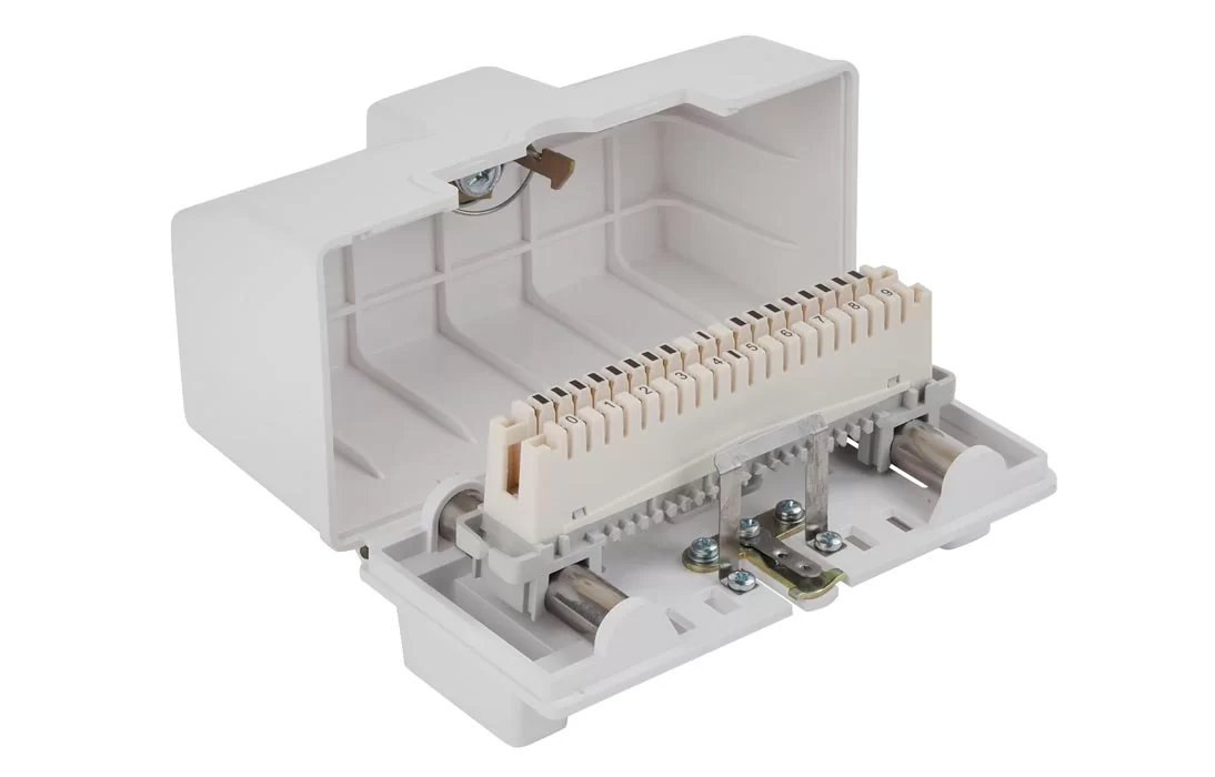 Конструкция узла крепления кабелей в коробках при необходимости обеспечивает надежный электрический контакт с экраном входящего распределительного кабеля, что облегчает его заземление. Ввод кабелей осуществляется через вырез в крышке, что упрощает монтаж и позволяет использовать для абонентской разводки не только провода ТРП/ТРВ, но и четырехпарные кабели типа UTP/FTP.