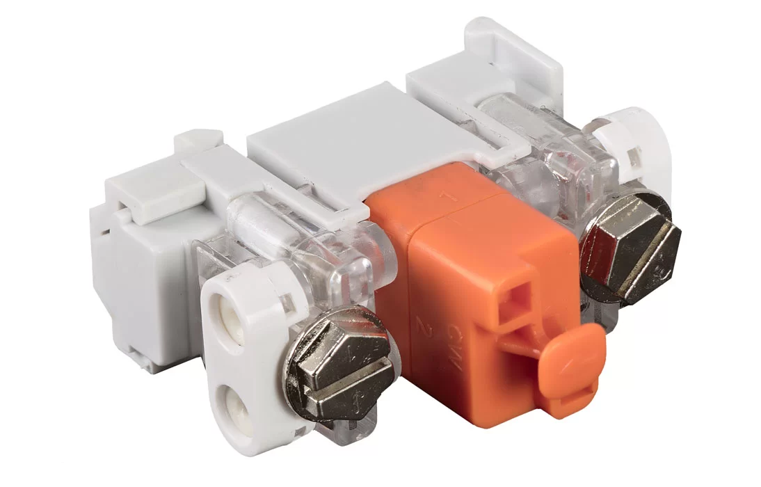 Изолированные жилы соединяемых пар по отдельности вводятся в глухие отверстия с противоположных сторон модуля, включение во врезные контакты соединителя достигается завинчиванием винтов.
