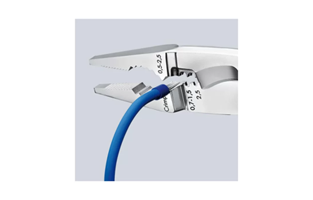 13 86 200 Электромонтажные клещи 6 функций в одних клещах. Mногофункциональные клещи для электромонтажных работ; для захвата плоского и круглого материала, гибки, удаления заусенцев, резки кабеля, удаления изоляции и опрессовки контактных гильз. Гладкие губки для захвата отдельных жил без их повреждения; профилированные губки и выемка для захвата плоского и круглого материала. Специальная наружная кромка на губке для обработки штепсельных розеток для скрытой проводки и удаления заусенцев на отверстиях для ввода кабеля. Удаление изоляции с проводов 0,75 – 1,5 мм² и 2,5 мм². Опрессовочное гнездо для контактных гильз 0,5 – 2,5 мм². Ножницы с прецизионными лезвиями (индуктивной закалки) для резки медного и алюминиевого кабеля до 5 x 2,5 мм² / Ø 15 мм. Узкая конструкция рабочей части облегчает доступ к детали. Винтовой шарнир: точный ход без люфта. Безопасность, проверенная VDE (Союз немецких электриков), до 1000В. - Параметры режима резки: медный кабель, многопроводный: Ø 15mm
