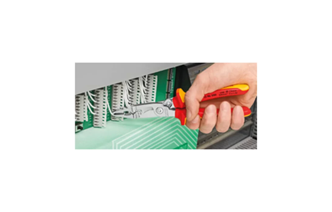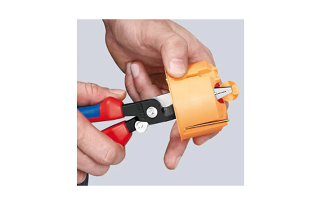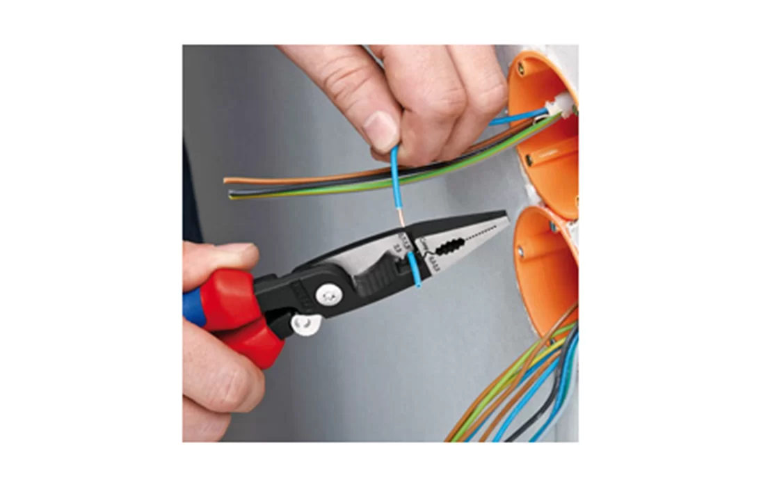 13 92 200 Электромонтажные клещи 6 функций в одних клещах. Mногофункциональные клещи для электромонтажных работ; для захвата плоского и круглого материала, гибки, удаления заусенцев, резки кабеля, удаления изоляции и опрессовки контактных гильз. Гладкие губки для захвата отдельных жил без их повреждения; профилированные губки и выемка для захвата плоского и круглого материала. Специальная наружная кромка на губке для обработки штепсельных розеток для скрытой проводки и удаления заусенцев на отверстиях для ввода кабеля. Удаление изоляции с проводов 0,75 – 1,5 мм² и 2,5 мм². Опрессовочное гнездо для контактных гильз 0,5 – 2,5 мм². Ножницы с прецизионными лезвиями (индуктивной закалки) для резки медного и алюминиевого кабеля до 5 x 2,5 мм² / Ø 15 мм. Узкая конструкция рабочей части облегчает доступ к детали. Винтовой шарнир: точный ход без люфта. В моделях с разжимающей пружиной закрытие защёлки приводит к смыканию лезвий, но не блокирует другие функции, благодаря рациональному механизму