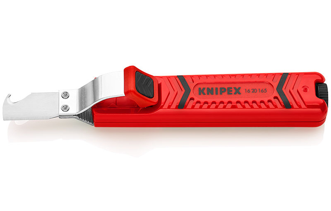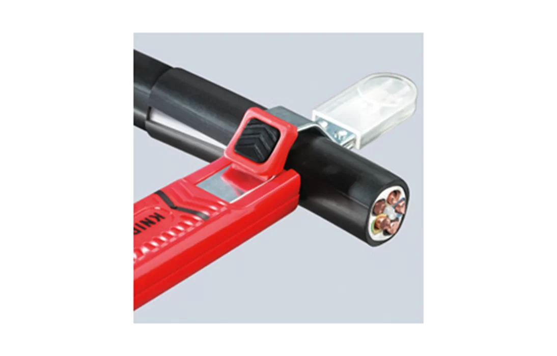 16 20 165 SB Стриппер для удаления оболочек всех распространенных круглых кабелей. Конструкция имеет самораскрывающуюся упорную скобу, настройку глубины резания установочным винтом, вращающееся лезвие для резов по окружности и продольных резов, сменное лезвие в корпусе инструмента, надежное удержание благодаря мягким вставкам на ручках и на фиксаторе, предотвращающим скольжение руки, нож с прямым лезвием и лезвием-крючком. Инструмент имеет диапазон рабочих диаметров от Ø 8,0 до 28,0mm