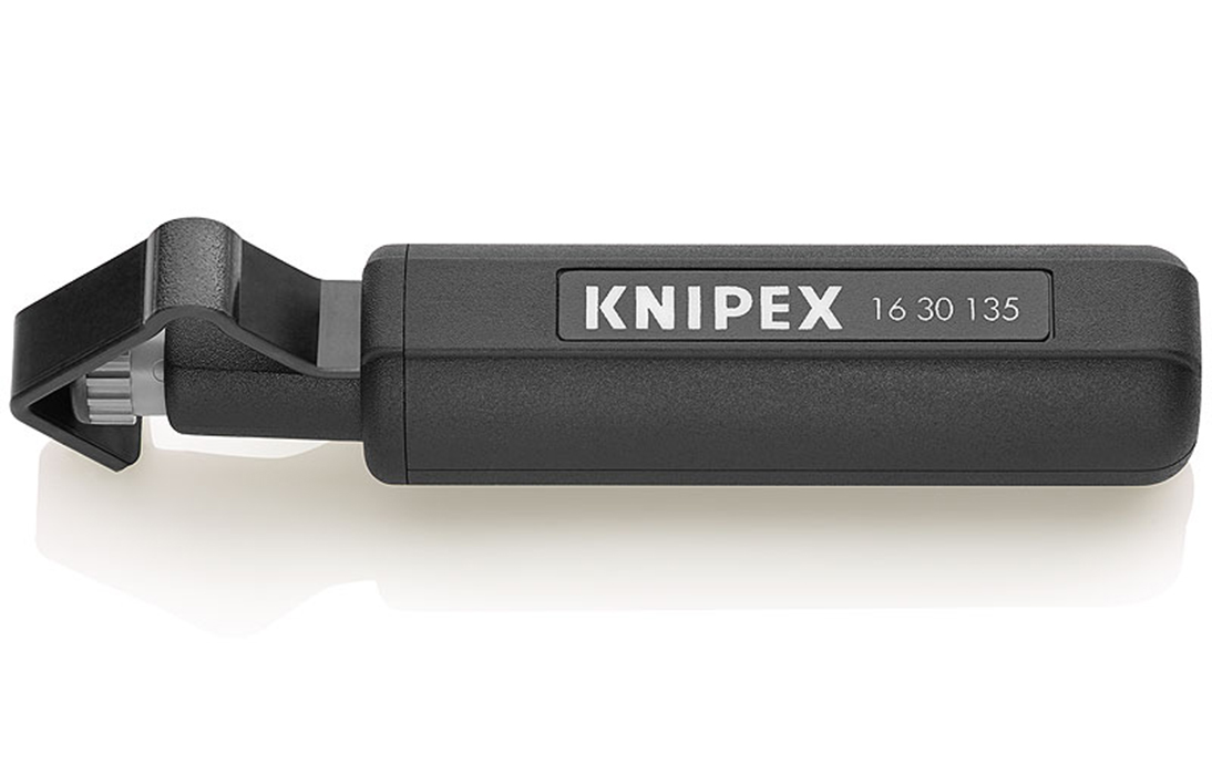 16 30 135 SB Стриппер для удаления оболочек. Для удаления оболочки из ПВХ, резины, силикона, тефлона с круглых кабелей. Cамораскрывающаяся упорная скоба. С настройкой глубины резания гайкой с накаткой. Вращающийся корпус ручки для кругового и продольного резания. Спиральный рез для удаления прокладок. Сменное лезвие.
