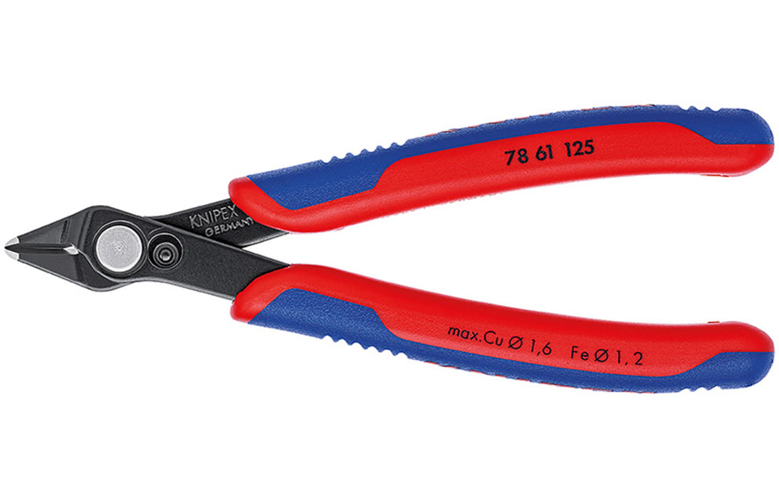 78 61 125 Electronic Super Knips® кусачки прецизионные для самых тонких работ по резанию, например, в электронике и точной механике. Шлифованные, очень острые режущие кромки без фасок. Прецизионные кончики режут заподлицо проволоку диаметром от 0,2 мм. Рез с контролируемым смещением режущей кромки – для увеличения срока службы и высокоточной резки самых тонких проводов. Шарнир с заклепкой из легированной стали. Исключительно легкий ход для работы с минимальным утомлением. С раскрывающей пружиной и ограничителем раскрытия. Также возможно резание стекловолоконных кабелей (световодов). Режущие кромки дополнительно закалены токами высокой частоты до твердости примерно 64 HRC. Специальная инструментальная сталь, многократно закалённая в масле.