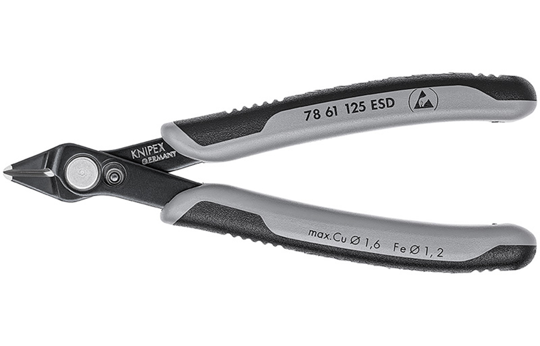 78 61 125 ESD Electronic Super Knips® ESD кусачки прецизионные для самых тонких работ по резанию, например, в электронике и точной механике. Ручки электроотводящие с рассеянием. Шлифованные, очень острые режущие кромки без фасок. Рез с контролируемым смещением режущей кромки – для увеличения срока службы и высокоточной резки самых тонких проводов. Прецизионные кончики режут заподлицо проволоку диаметром от 0,2 мм. Шарнир с заклепкой из легированной стали. Исключительно легкий ход для работы с минимальным утомлением. С раскрывающей пружиной и ограничителем раскрытия. Режущие кромки дополнительно закалены токами высокой частоты до твердости примерно 64 HRC. Сталь инструментальная специальная, вороненая.