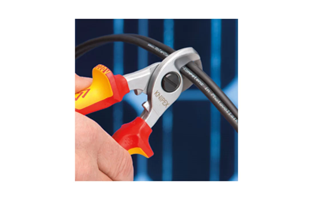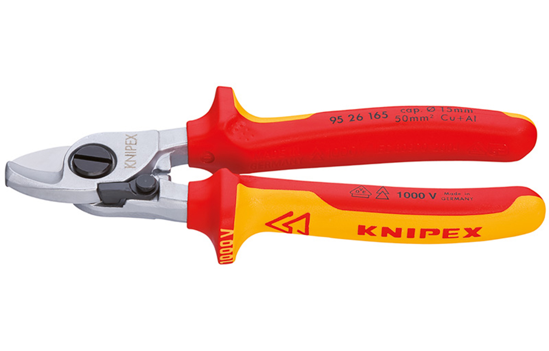 95 26 165 Кабелерез для реза медного и алюминиевого кабеля, одно- и многожильного. Режут гладко и чисто, без деформации материала. Не подходит для стальной проволоки и твёрдотянутых медных проводников. Закаленные режущие кромки с прецизионной шлифовкой. Легко резать одной рукой. С защитой для рук. Регулируемый шарнир, винтовой, самофиксирующийся. Внутренняя пружина, защищенная от загрязнения или ее утери.