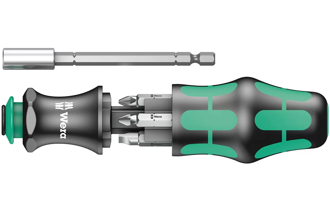 Компактный инструмент Wera Kompakt с многокомпонентной ручкой Kraftform для высокой скорости работы при особой эргономичности. Встроенный в ручку магазин, в котором можно хранить 6 битов. Выдвижной стержень можно задвинуть для работы в ограниченном пространстве. Его также можно извлечь для использования с электроинструментом. С сильным постоянным магнитом для надёжной посадки бита.
