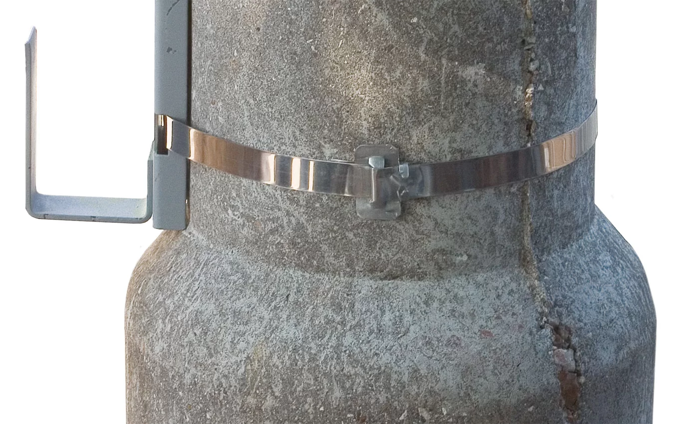 Лента монтажная (бандажная) и замки-фиксаторы (скрепы) из нержавеющей стали применяются для подвески шкафов и крепления арматуры волоконно-оптических линий связи на столбовых опорах.