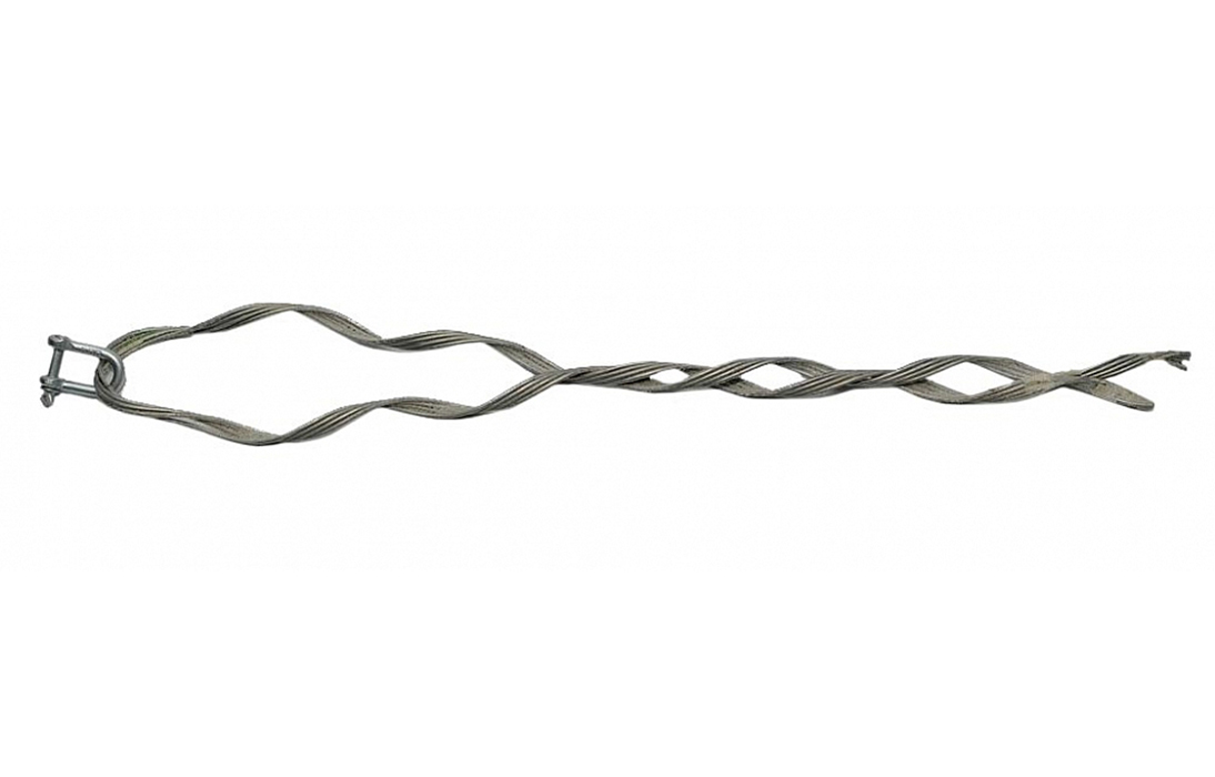 Натяжной спиральный зажим (зажим) представляет собой U-образную силовую спиральную прядь из нескольких спиральных проволок, скрепленных между собой специальным клеем. На внутреннюю поверхность ветвей пряди, соприкасающихся с кабелем, нанесено абразивное покрытие.