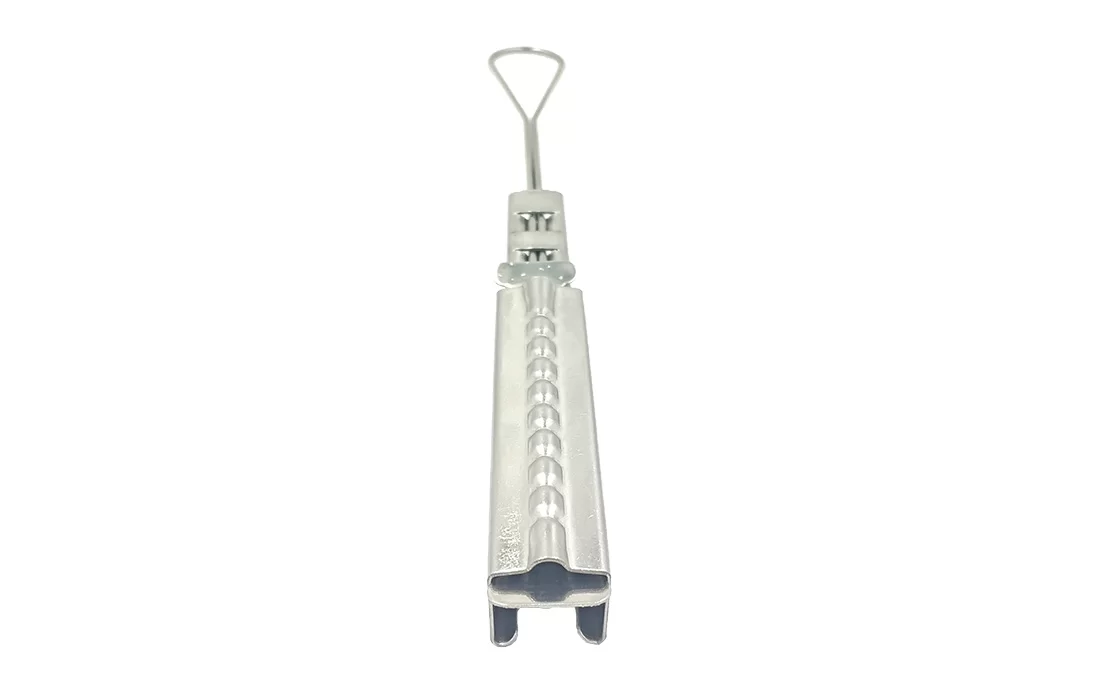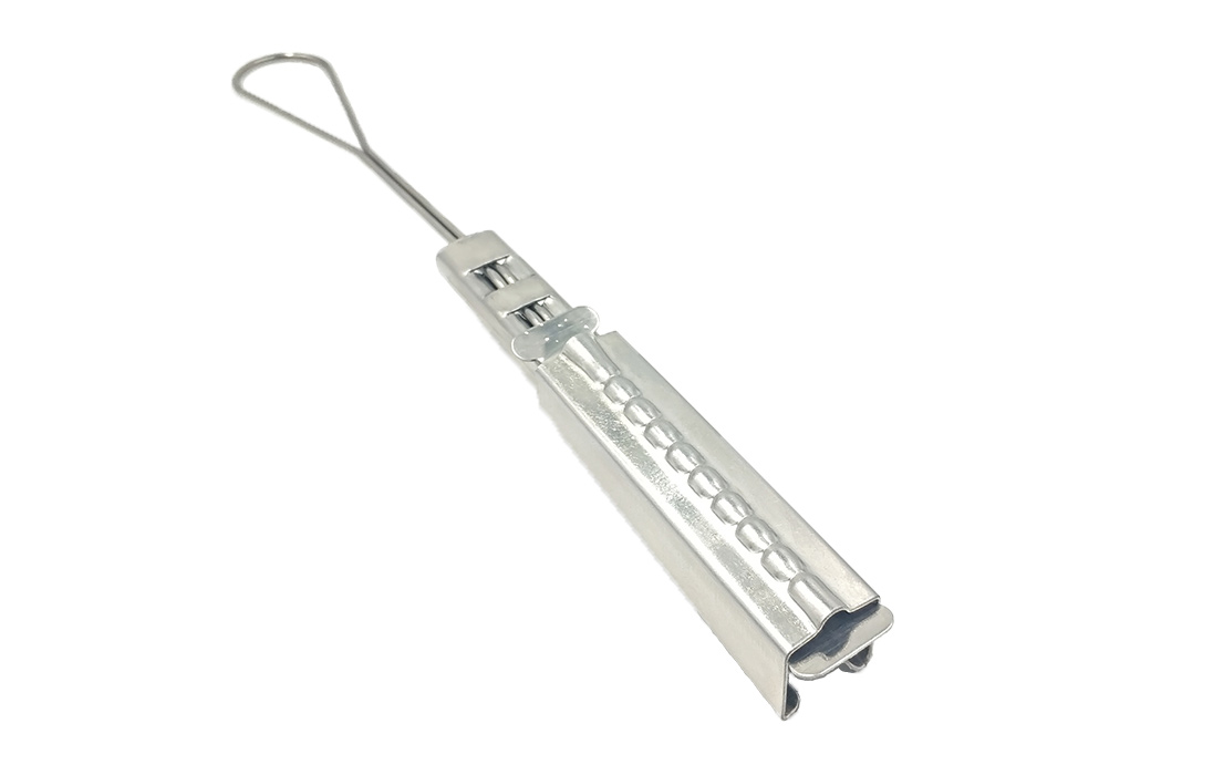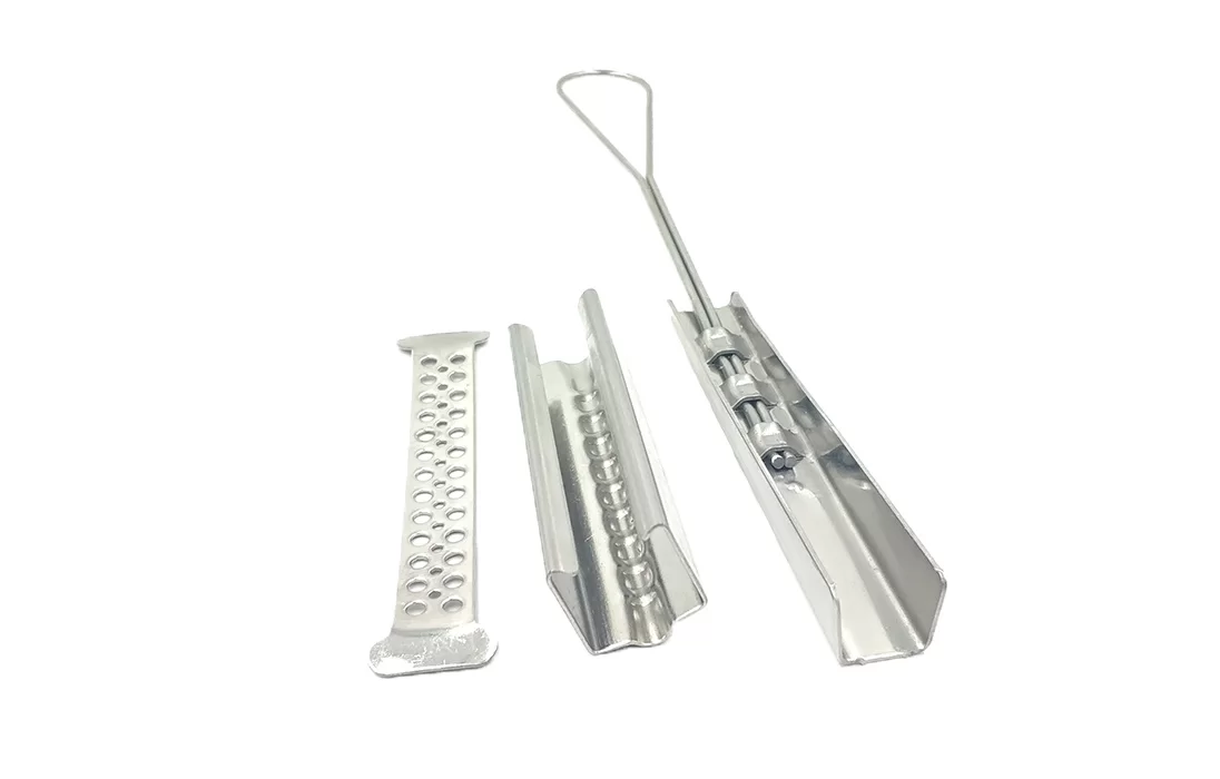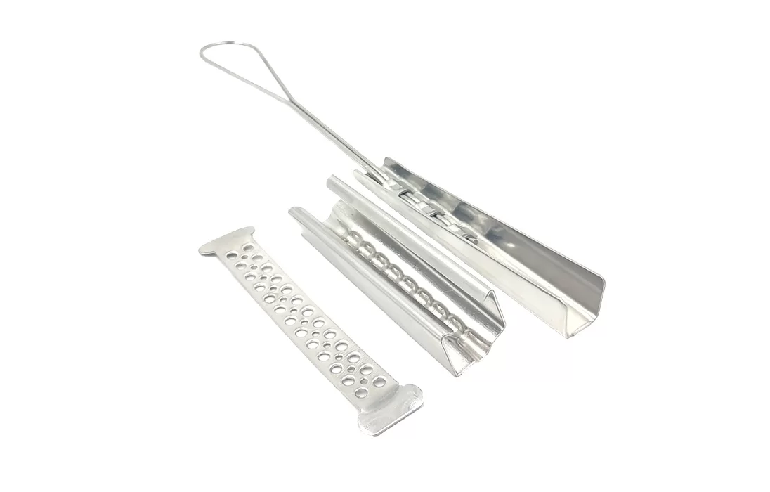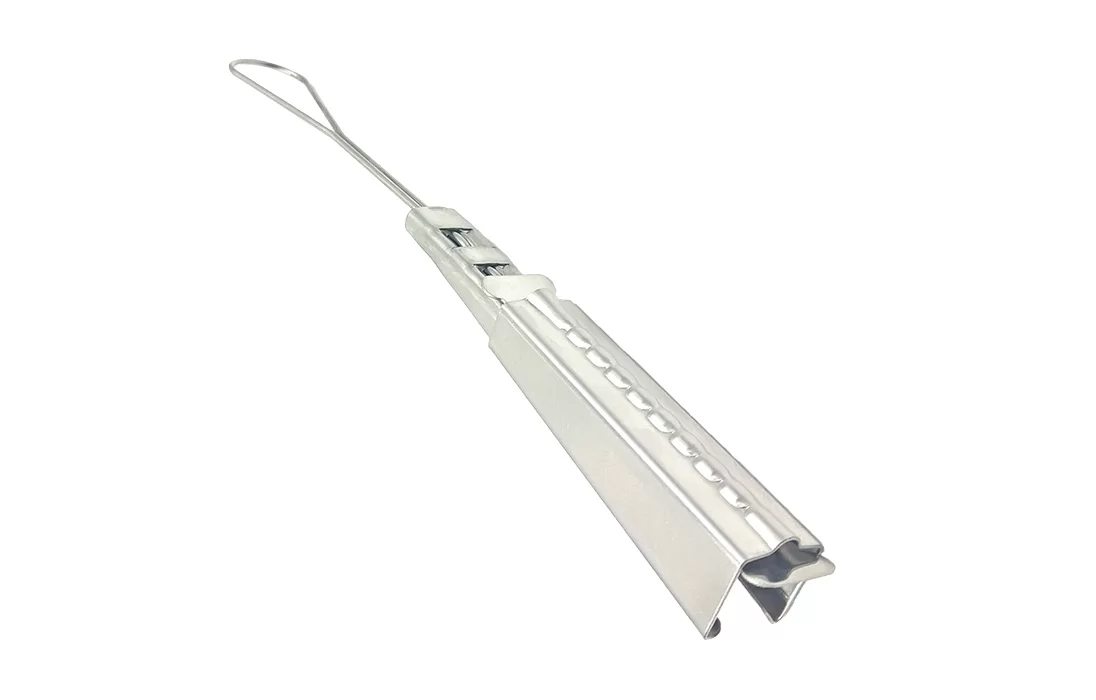 Зажимы изготавливаются из нержавеющей стали. Конструкция зажима исполнена из продольного ребристого корпуса, перфорированной вставки для лучшего сцепления с наружной оболочкой плоских и овальных кабелей и клинообразным стержнем с прикрепленной петлей для монтажа к кронштейнам и узлам.