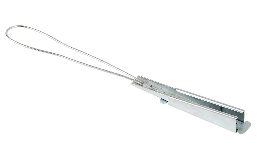 Состоит из открытого корпуса с ребристой контактной поверхностью, клина с прикрепленной проволочной петлей и "терки" - перфорированной вставки, которая прокладывается между кабелем и клином. Конструкция зажима обеспечивает прочное крепление кабеля. Материал изделия – корпус, клин, вставка и петля из оцинкованной стали.