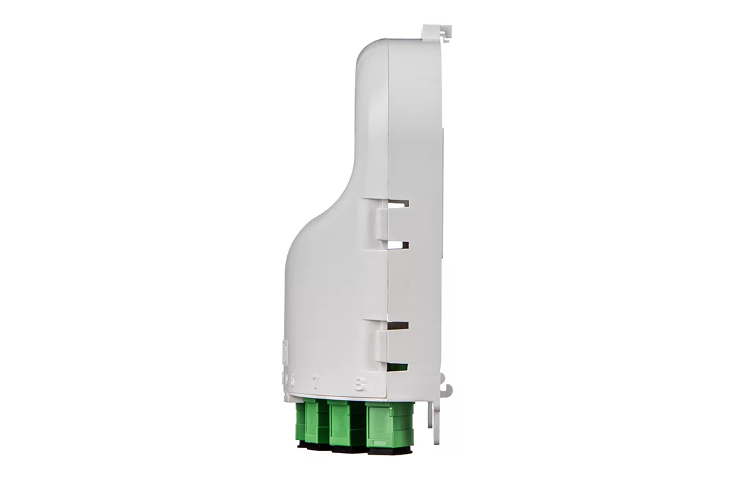Конструкций модуля позволяет установить PLC разветвители, оконцованные разъёмами SC типа: два 1х4 или один 1х8. При этом как входные так и выходные разъёмы разветвителей будут подключены в адаптеры модуля.