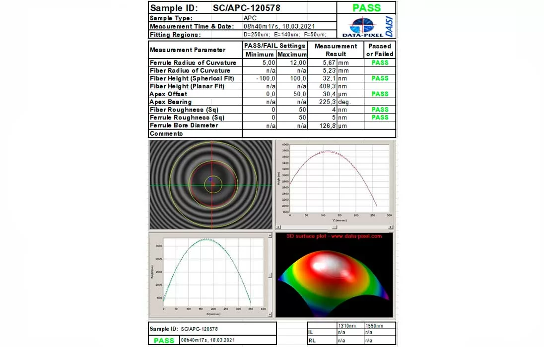 Высокое качество оптических шнуров серии ССД HS гарантируется 100% контролем качества оптических параметров шнуров. Типовое качество полировки торца ферулы приведено на фото с экрана интерферометра.