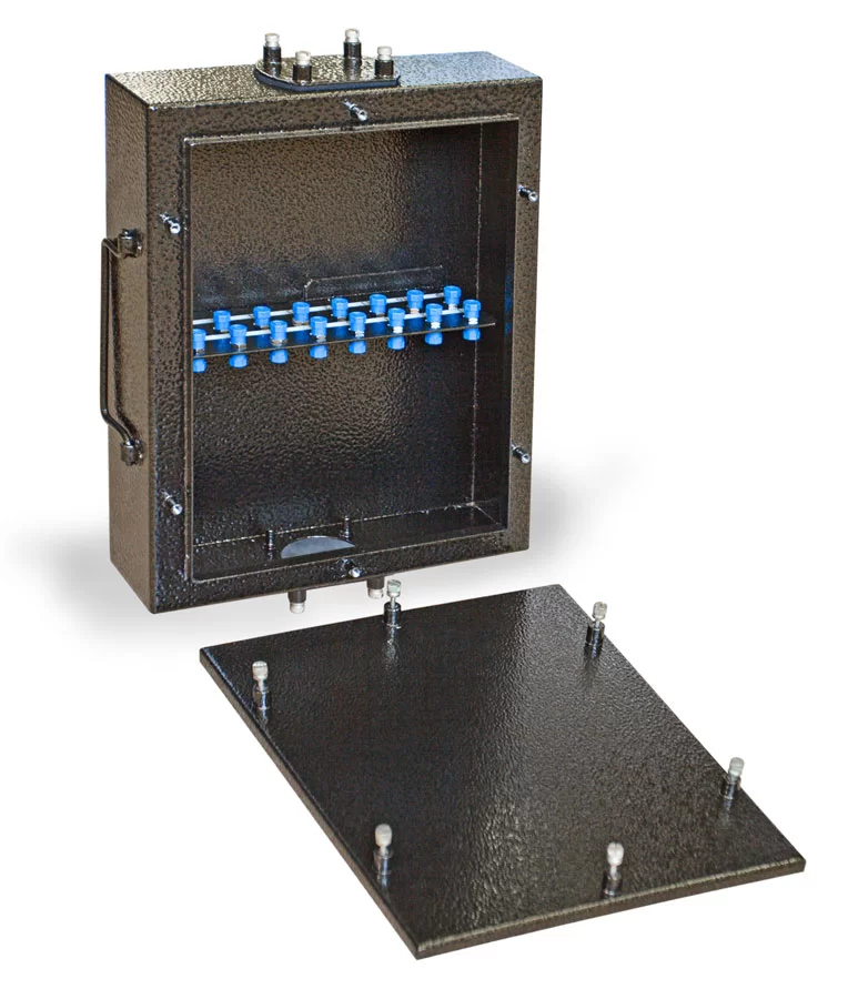 В рабочем положении каждый конец оптического кабеля кабельной секции подсоединяется к устройству защиты мест соединений (УЗМС). УЗМС представляет собой двухсекционную герметичную металлическую коробку с установленными на патч-панели оптическими розетками FC. Возможно легкосъемное крепление УЗМС на щеке барабана кабельной секции.