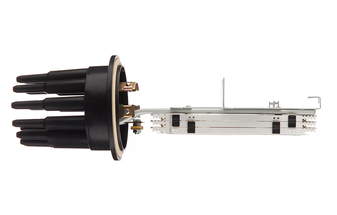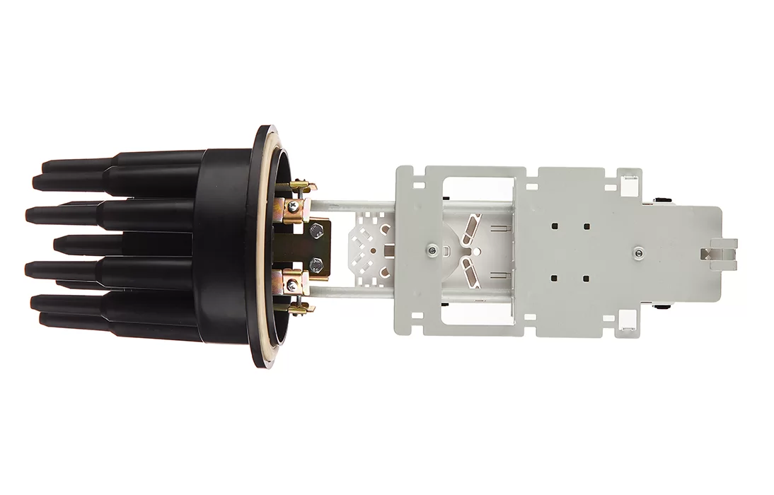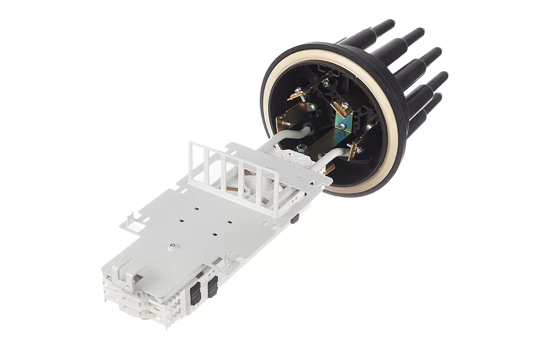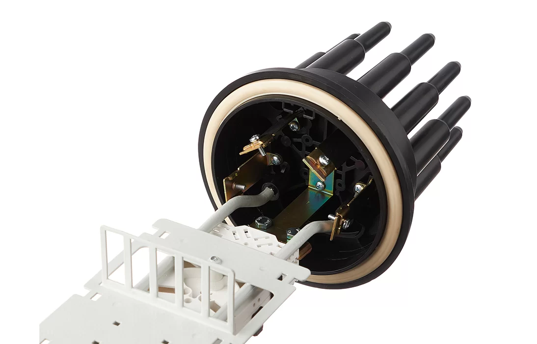 Способ герметизации вводов кабелей, осуществляется с помощью термоусаживаемых трубок ТУТ. Круглые патрубки на оголовнике муфты изначально герметичны и имеют ступенчатую форму с разными диаметрами. Срезая патрубок в определенном месте можно подобрать отверстие максимально близкое к диаметру вводимого кабеля. Таким образом, исключается излишнее натяжение ТУТ после усадки при вводе относительно тонких кабелей. Все патрубки муфты оснащены также индивидуальными узлами крепления ЦСЭ.