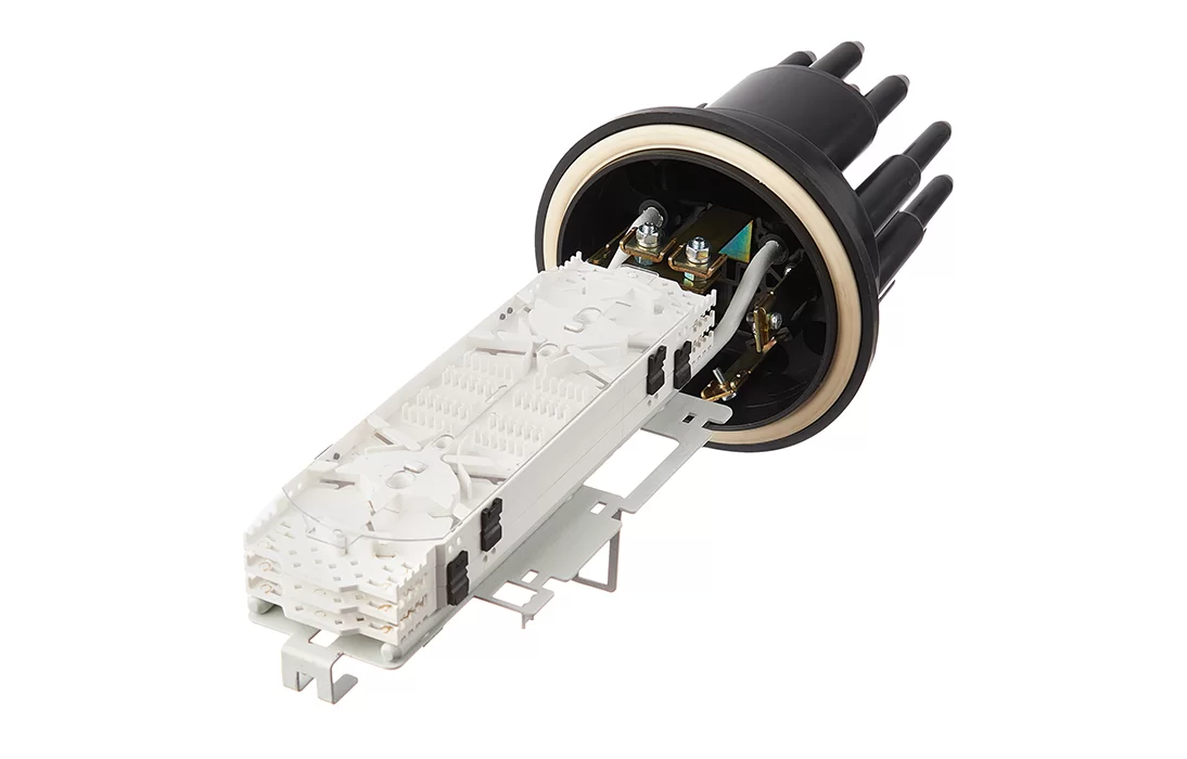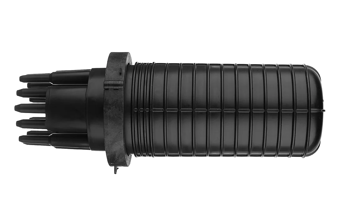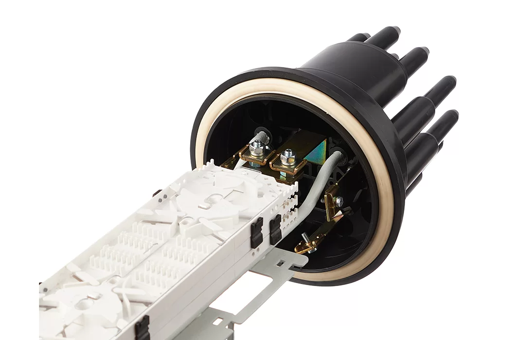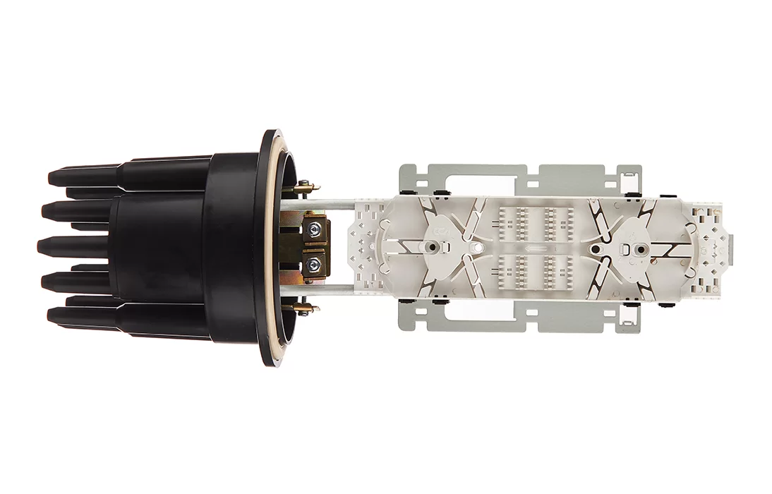 В муфте предусмотрен овальный ввод для транзитной петли оптических модулей без разрезания. Выкладка петли модулей осуществляется на лотке с противоположной стороны от кассет.
