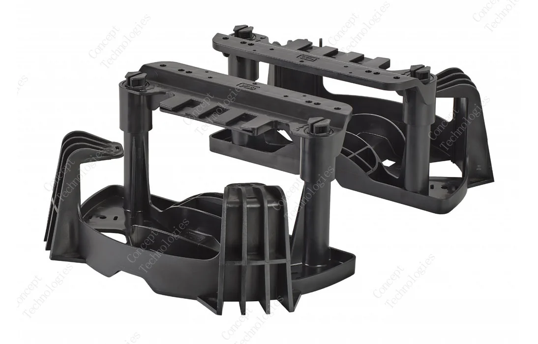 Все детали УПМК изготовлены из пластика, что уменьшает нагрузку на опору и облегчает монтаж, а также значительно увеличивает стойкость изделия к воздействию повышенной влажности и УФ-излучению. Крепление к стенам осуществляется с помощью анкерных болтов или шурупов, а к столбовым опорам монтажной металлической лентой. Конструкция кронштейна для муфт позволяет снимать муфту с опоры и устанавливать ее обратно, без использования специального инструмента и расходных материалов, фиксация осуществляется специальными пластиковыми защёлками. Органайзеры для укладки запаса ВОК разнесены в плоскостях с кронштейном для установки муфт, что исключает пересечение выходящих из муфт-кроссов абонентских дроп-кабелей с бухтой запаса ВОК.