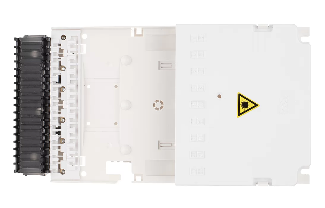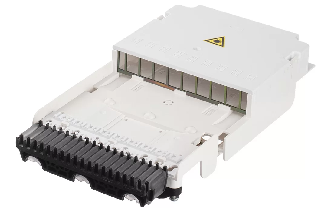 Внутри корпуса установлена съёмная монтажная панель (вставка), с тыльной стороны которой предусмотрено место для укладки транзитной петли оптических модулей, установлены фиксаторы ЦСЭ и кассеты для сварки волокон распределительных ВОК, а также ложементы, на который можно установить разветвители в мини-корпусах с волокнами в буферном покрытии 900 мкм. Предусмотрена установка двух разветвителей в мини-корпусах 1х8 -PLC -SM/0,9 -1,0 м-SC/APC или четырёх разветвителей 1х4 -PLC -SM/0,9 -1,0 м-SC/APC или одного разветвителя 1х16 -PLC -SM/0,9 -1,0 м-SC/APC. На лицевой стороне панели расположена планка для адаптеров SC типа и ложементы Л12-4525 для размещения сварных стыков абонентских дроп-кабелей с пигтейлами. Место размещения сварных соединений дроп-кабелей защищено специальной пластиковой крышкой.