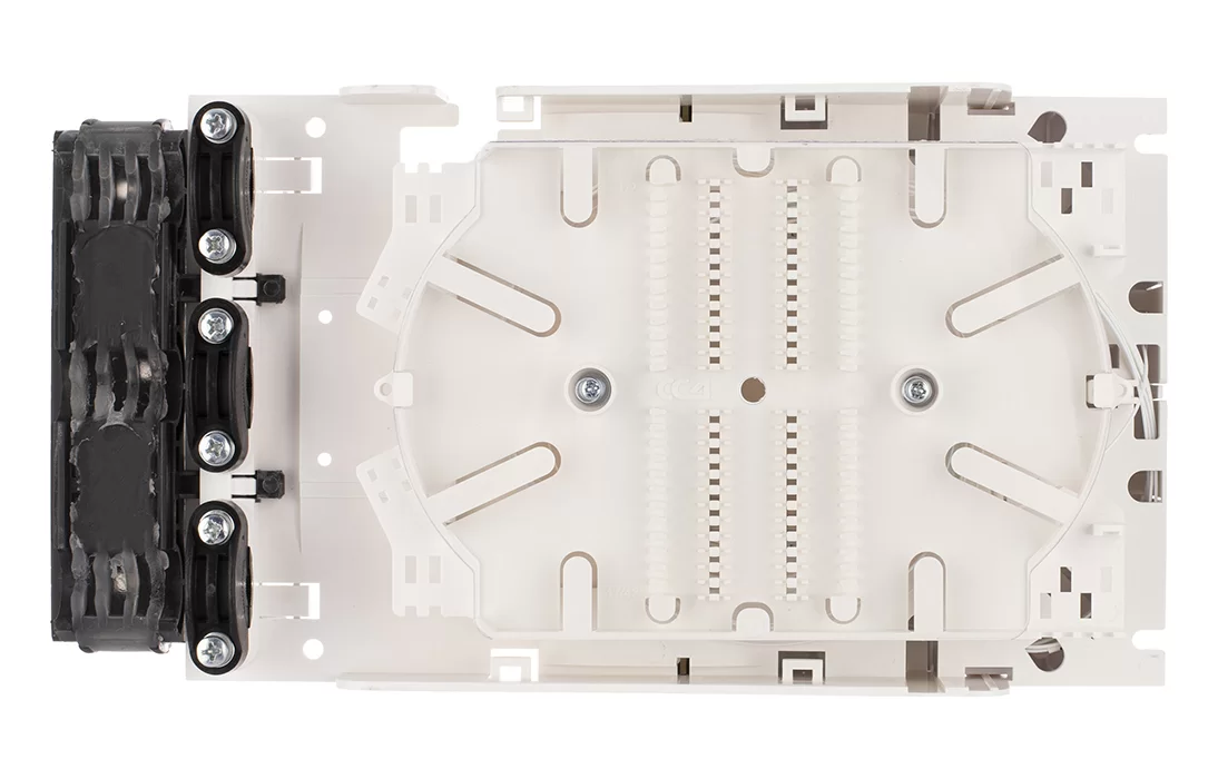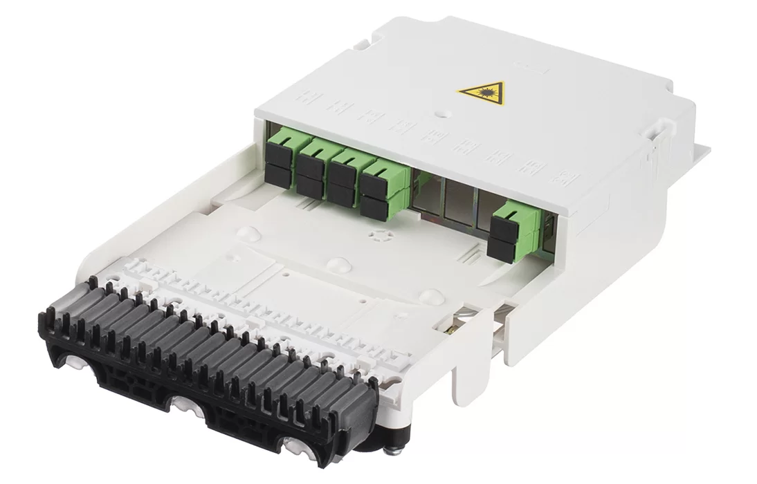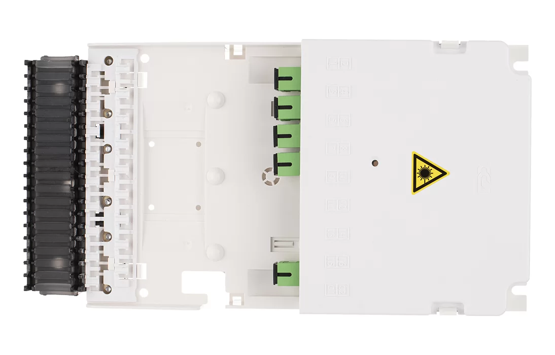 Внутри корпуса установлена съёмная монтажная панель (вставка), с тыльной стороны которой предусмотрено место для укладки транзитной петли оптических модулей, установлены фиксаторы ЦСЭ и кассеты для сварки волокон распределительных ВОК, а также ложементы, на который можно установить разветвители в мини-корпусах с волокнами в буферном покрытии 900 мкм. Предусмотрена установка двух разветвителей в мини-корпусах 1х8 -PLC -SM/0,9 -1,0 м-SC/APC или четырёх разветвителей 1х4 -PLC -SM/0,9 -1,0 м-SC/APC или одного разветвителя 1х16 -PLC -SM/0,9 -1,0 м-SC/APC. На лицевой стороне панели расположена планка для адаптеров SC типа и ложементы Л12-4525 для размещения сварных стыков абонентских дроп-кабелей с пигтейлами. Место размещения сварных соединений дроп-кабелей защищено специальной пластиковой крышкой.