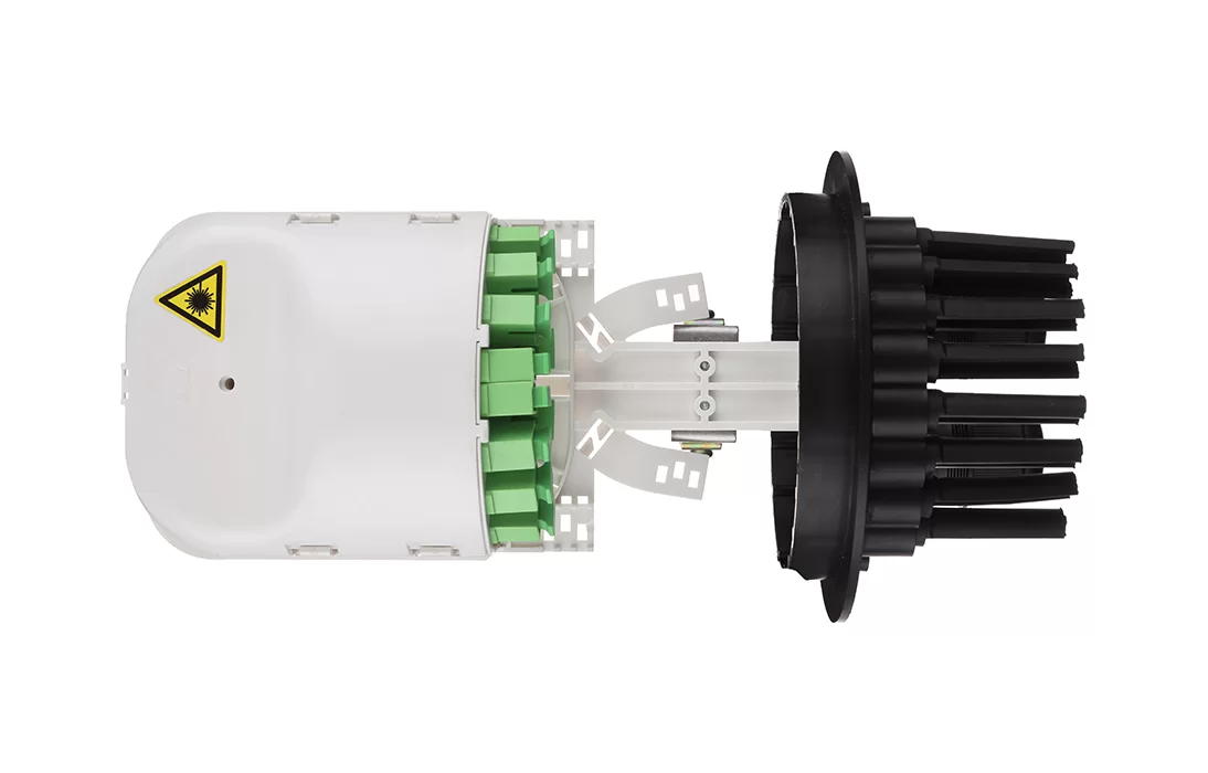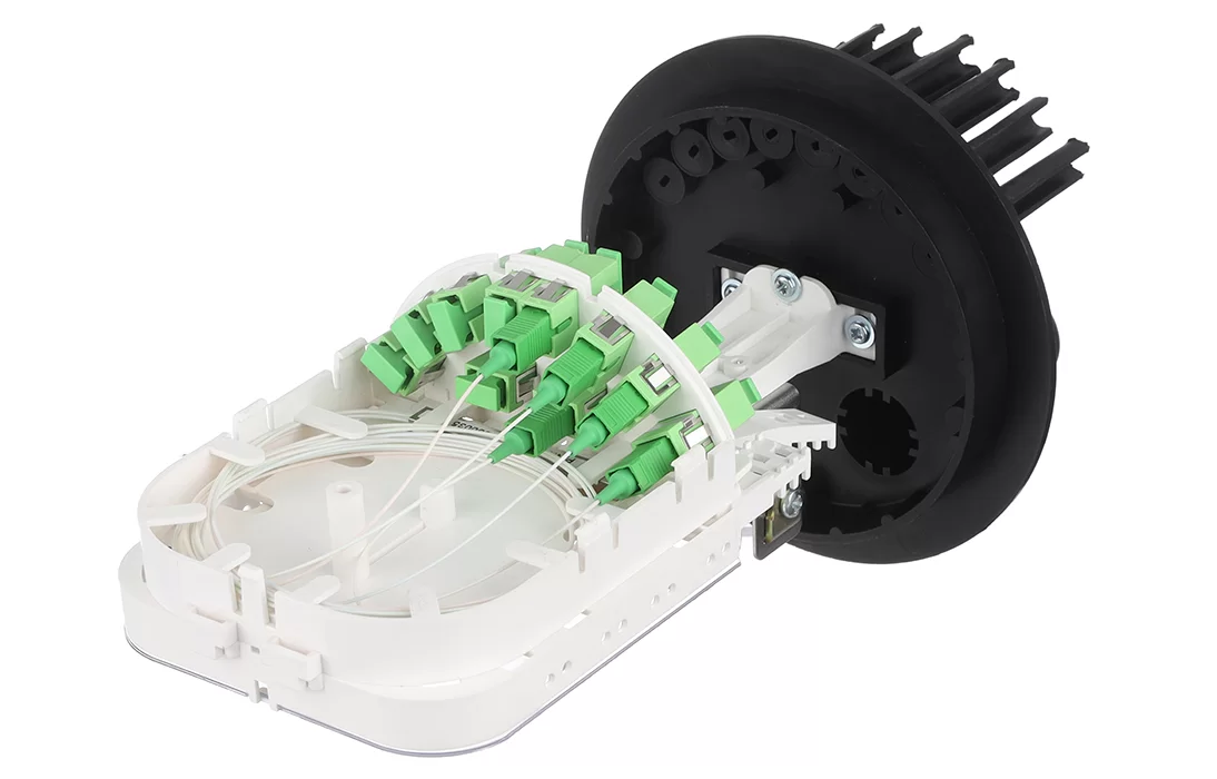 В обновлённой конструкции муфты установлен внутренний лоток-кассета с литым ложементом для 48 сварных соединений, а так же специальный сплиттерный модуль СМ4, в который, в данной комплектации уже установлены 10 адаптеров SC-типа и один PLC разветвитель 1х4.