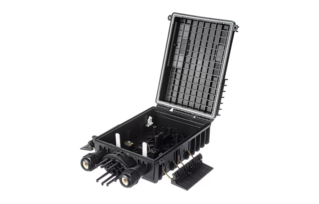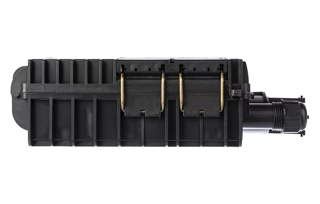 Выполнена из пластмассы и имеет пыле-брызгозащищенную конструкцию (ввод ОК и вывод абонентских дроп-кабелей производится с одной стороны).