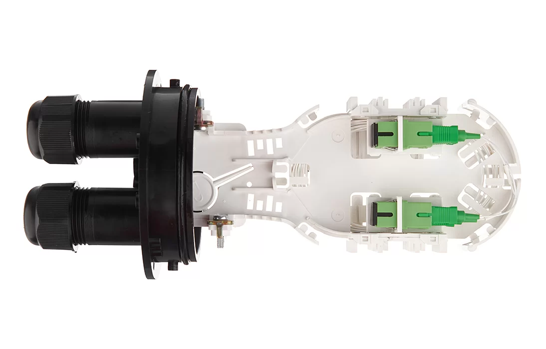 Ввод абонентских дроп-кабелей осуществляется с помощью проходных отверстий на оголовнике, диаметр которых позволяет вводить в муфту дроп-кабели с разъемами SC типа. Герметизация вводов достигается с помощью разрезных эластичных втулок (заглушек).