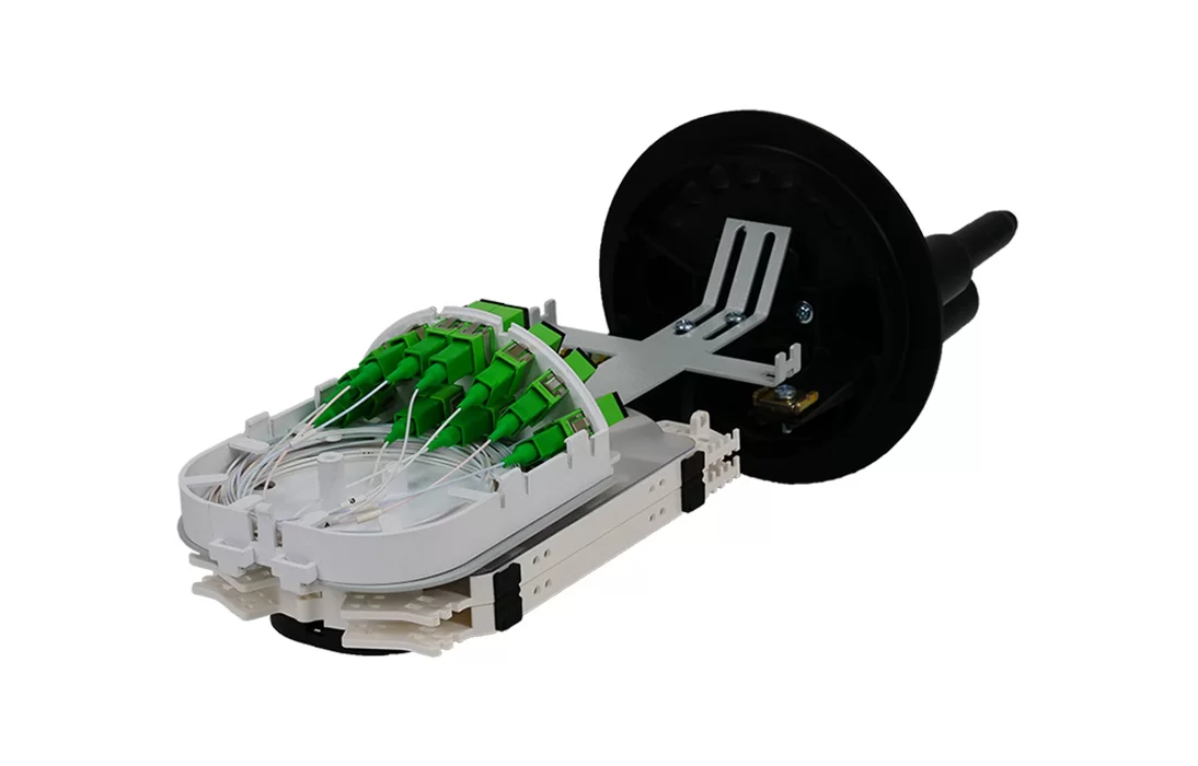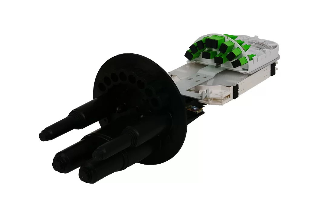 В муфте установлен специальный сплиттерный модуль СМ4, в который в зависимости от комплектации могут быть установлены 10 адаптеров SC-типа и один PLC разветвитель 1х8 или два PLC разветвителя 1х4 оконцованных разъёмами SC типа.