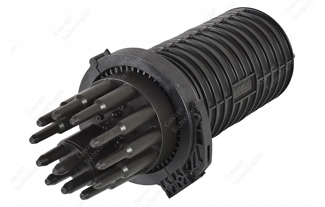 Способ герметизации вводов кабелей, осуществляется с помощью термоусаживаемых трубок ТУТ. Круглые патрубки на оголовнике муфты изначально герметичны и имеют ступенчатую форму с разными диаметрами. Срезая патрубок в определенном месте можно подобрать отверстие максимально близкое к диаметру вводимого кабеля. Таким образом, исключается излишнее натяжение ТУТ после усадки при вводе относительно тонких кабелей. Все патрубки муфты оснащены также индивидуальными узлами крепления ЦСЭ.