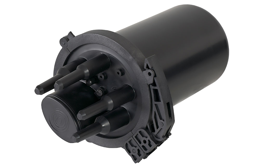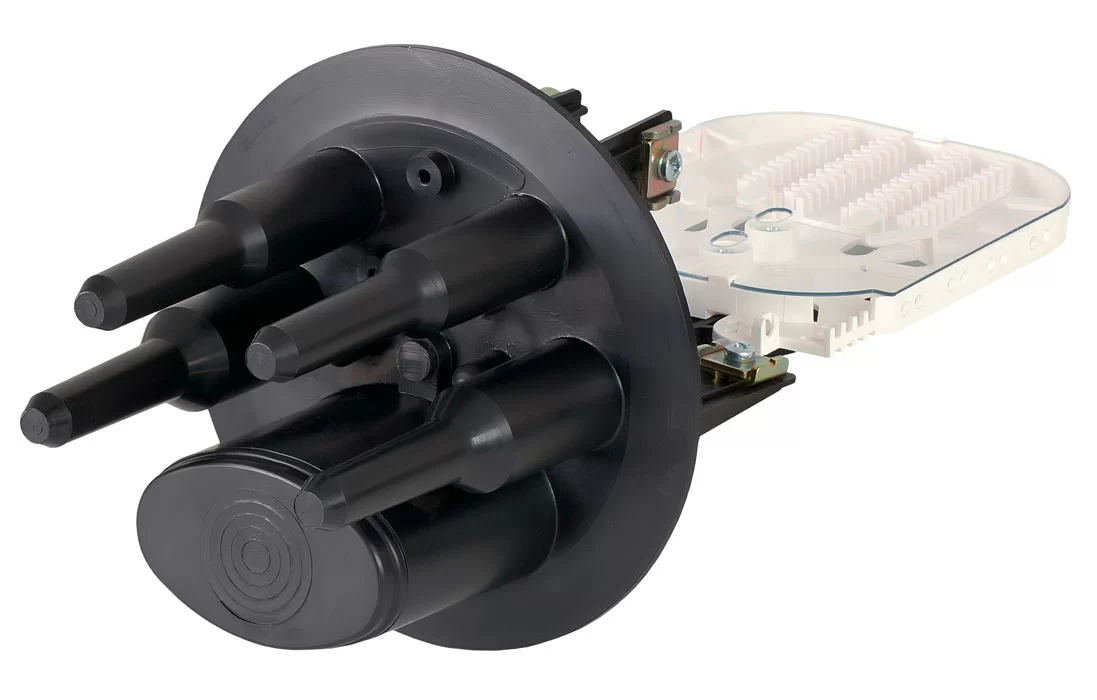 Способ герметизации вводов кабелей, осуществляется с помощью термоусаживаемых трубок ТУТ. Круглые патрубки на оголовнике муфты изначально герметичны и имеют ступенчатую форму с разными диаметрами. Срезая патрубок в определенном месте можно подобрать отверстие максимально близкое к диаметру вводимого кабеля. Таким образом, исключается излишнее натяжение ТУТ после усадки при вводе относительно тонких кабелей. Все патрубки муфты оснащены также индивидуальными узлами крепления ЦСЭ.