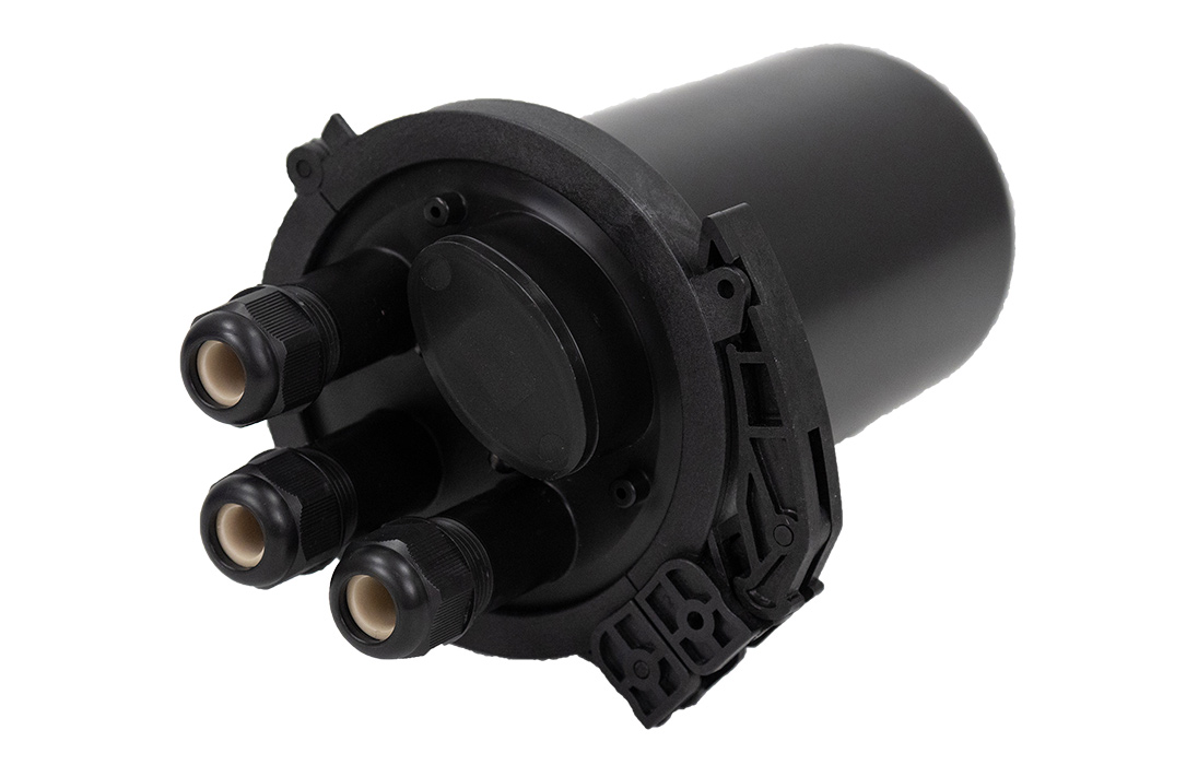 Ввод кабеля, крепление и герметизация осуществляется с помощью резьбовых фитингов, отлитых непосредственно на оголовнике муфты. Муфта имеет три круглых патрубка с фитингами и один овальный, герметизация вводимых кабелей осуществляется также механическим способом. Используя специальные комплекты для ввода в овальный патрубок можно ввести как два отдельных кабеля, так и транзитный. Заглушка овального ввода выламывается при помощи молотка.