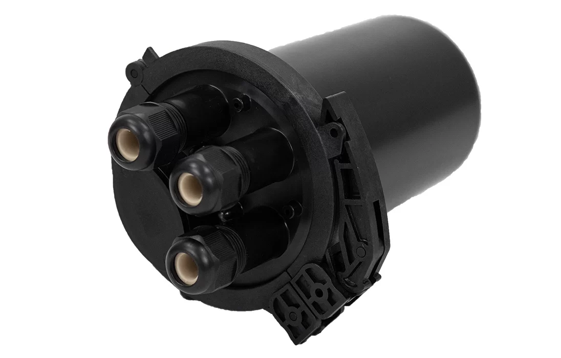 Ввод кабеля, крепление и герметизация осуществляется с помощью резьбовых фитингов, отлитых непосредственно на оголовнике муфты. Муфта имеет три круглых патрубка с фитингами и один овальный, герметизация вводимых кабелей осуществляется также механическим способом. Используя специальные комплекты для ввода в овальный патрубок можно ввести как два отдельных кабеля, так и транзитный. Заглушка овального ввода выламывается при помощи молотка.