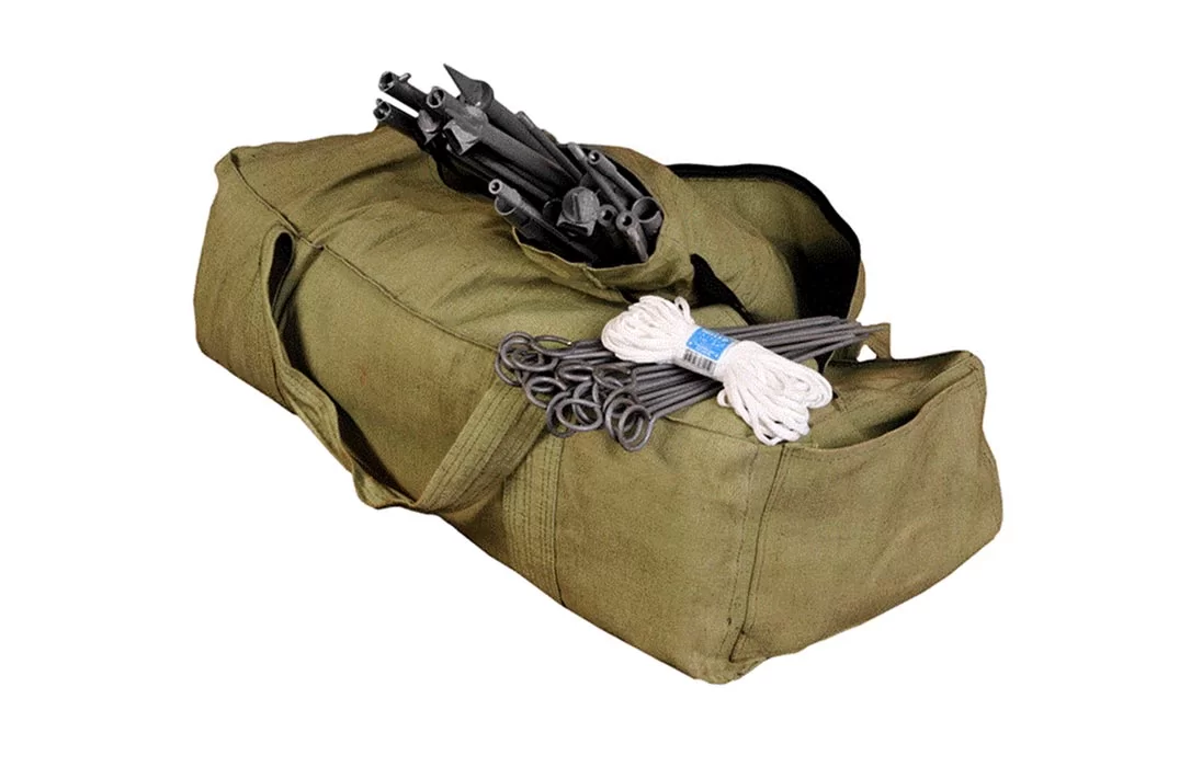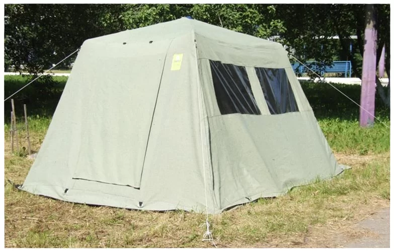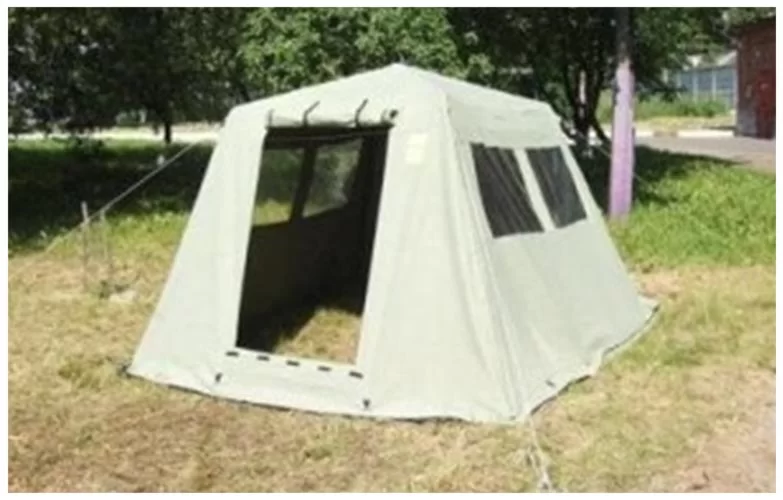 Палатка изготовлена из брезента пропитанного огнеупорным составом, имеет вход с двух сторон и четыре окна, собирается на металлическом каркасе, предназначена для монтажных и ремонтно-восстановительных работ.