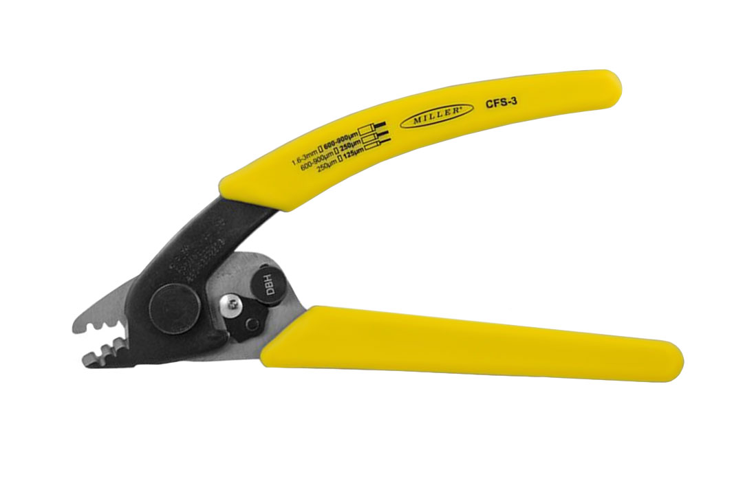 CFS-3 - стриппер для работы с оптическим волокном, имеющий три отверстия для снятия оболочек различного диаметра: 1ое –для удаления 2-3 мм буфера, 2ое- для удаления 900мкм буфера и 3е – для снятия 250мкм лакового покрытия волокна.