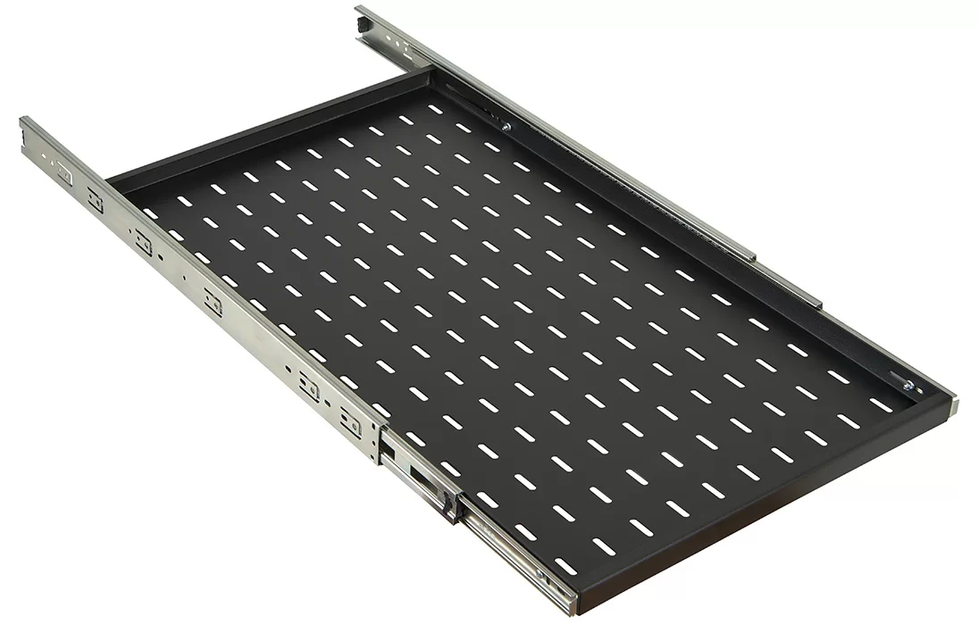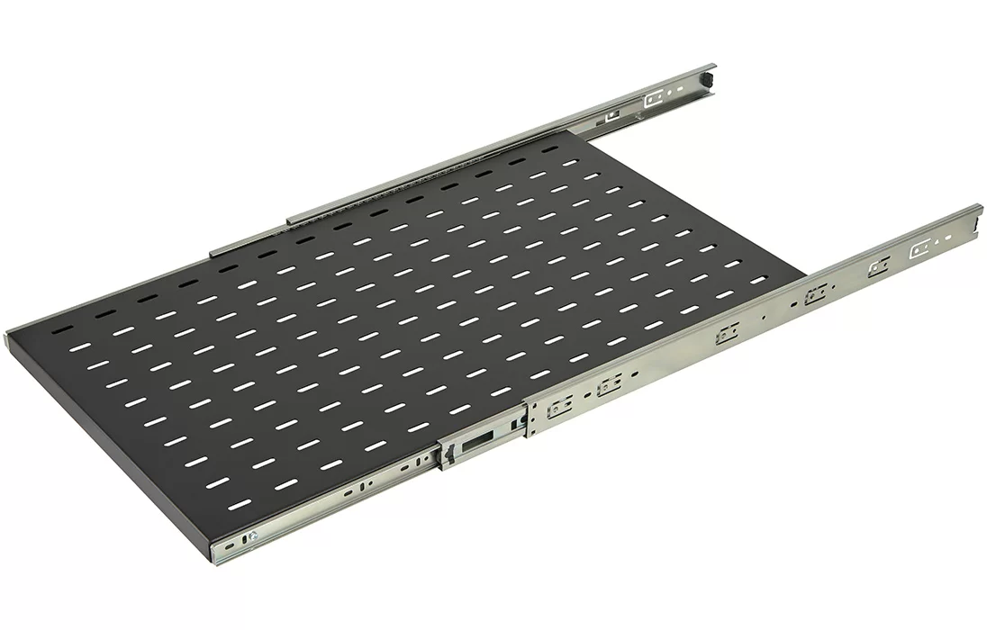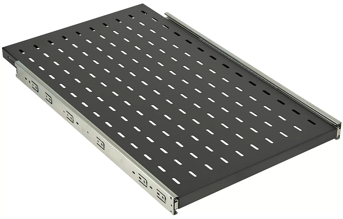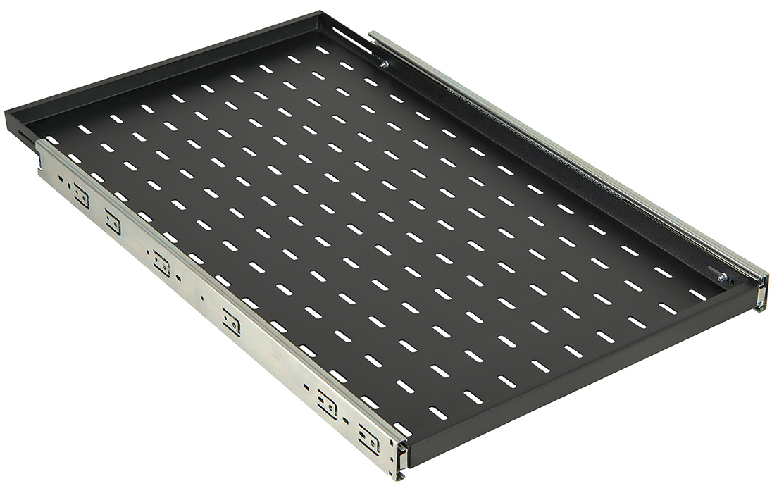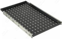 Полка выполнена из металла 1,5 мм, имеет телескопические направляющие, обеспечивающие плавное выдвижение. Монтажные кронштейны фиксируют полку к вертикальным направляющим шкафов и стоек в четырех местах. Глубина монтажных кронштейнов регулируется, что позволяет устанавливать полку на необходимую глубину. Распределительная нагрузка на полку составляет 30 кг.