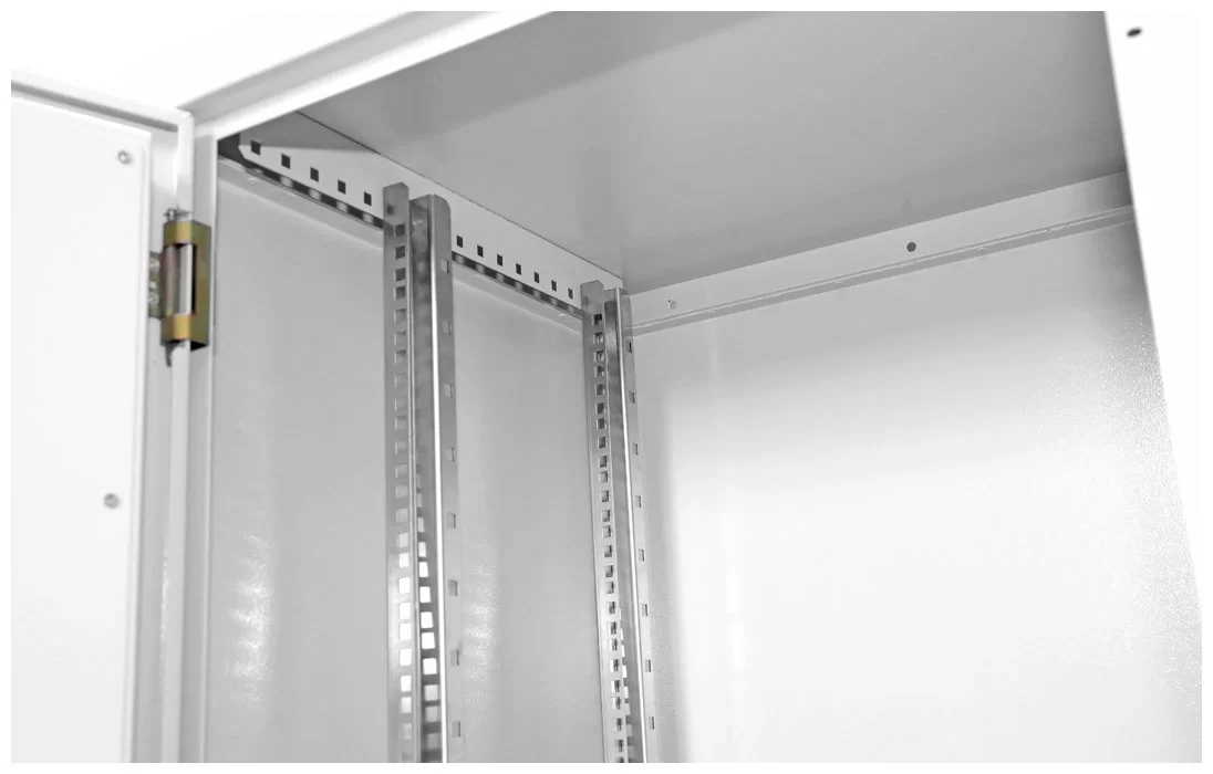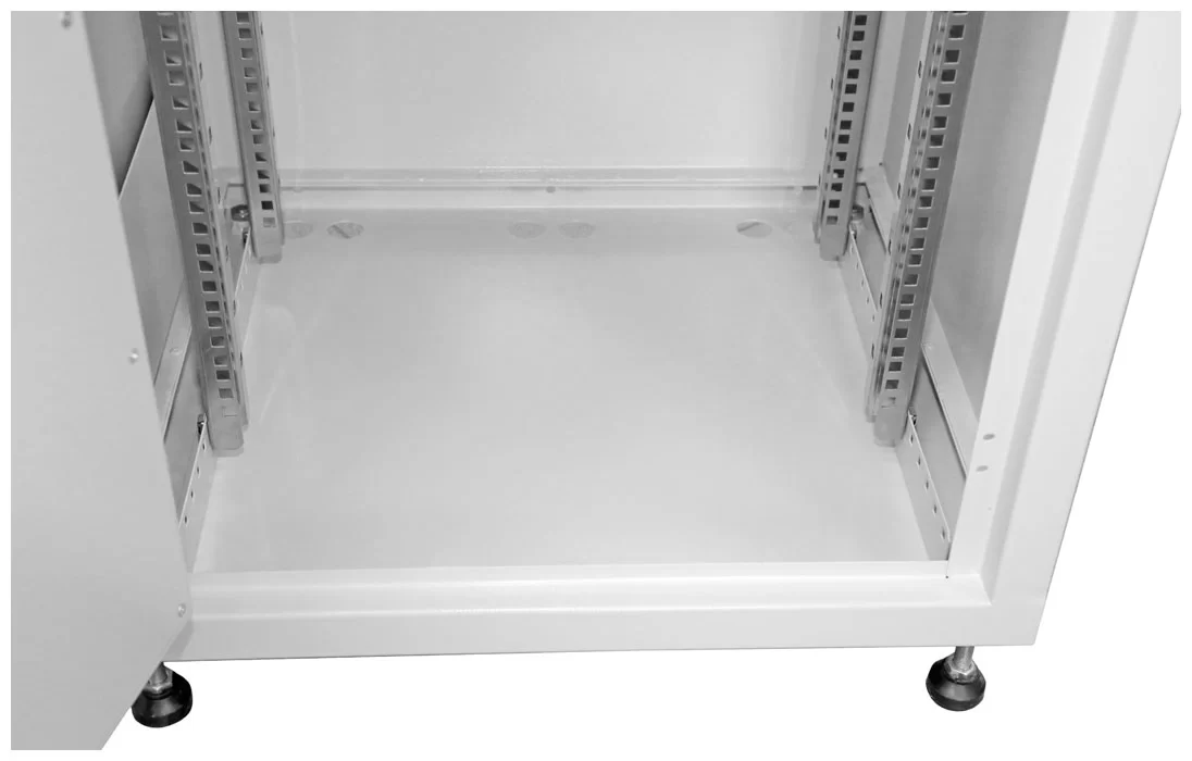 Шкаф комплектуется двумя парами вертикальных (юнитовых) направляющих, регулируемых по глубине. Для вентиляции оборудования предусмотрена перфорация в боковых стенках шкафа. Отверстия изнутри защищены металлическими перфорированными панелями. В основании шкафа предусмотрены защищенные кабельные вводы и система заземления.